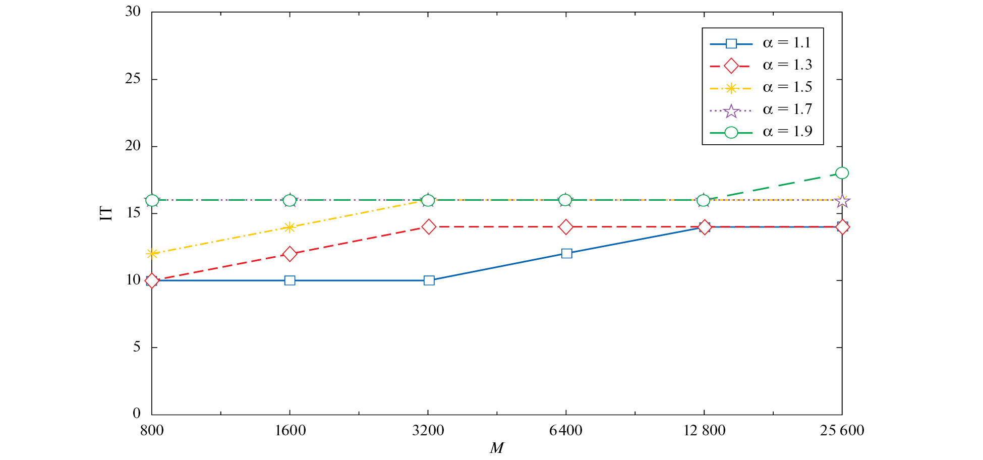 Таблицы 9, 10 и рисунок 13 сообщают об относительных ошибках дискретной массы и энергии. Соответствующий размер пространственной сетки и размер временного шага составляют h = 0.1, τ = 0.01. На каждом временном уровне блочные линейные системы, связанные с u и v, решаются с помощью CNAS-GMRES и прекращаются, когда относительные невязки блочных линейных систем по ℓ2-норме уменьшаются ниже 10−15. Небольшие ошибки, показанные в табл. 9, 10 и на рис. 13, показывают, что как дискретная масса, так и энергия схемы LICD сохраняются линейным решателем CNAS-GMRES при < α = 2, β = 1 >, < α = 1.6, β = 1 > и < α = 1.5, β = 2 >.