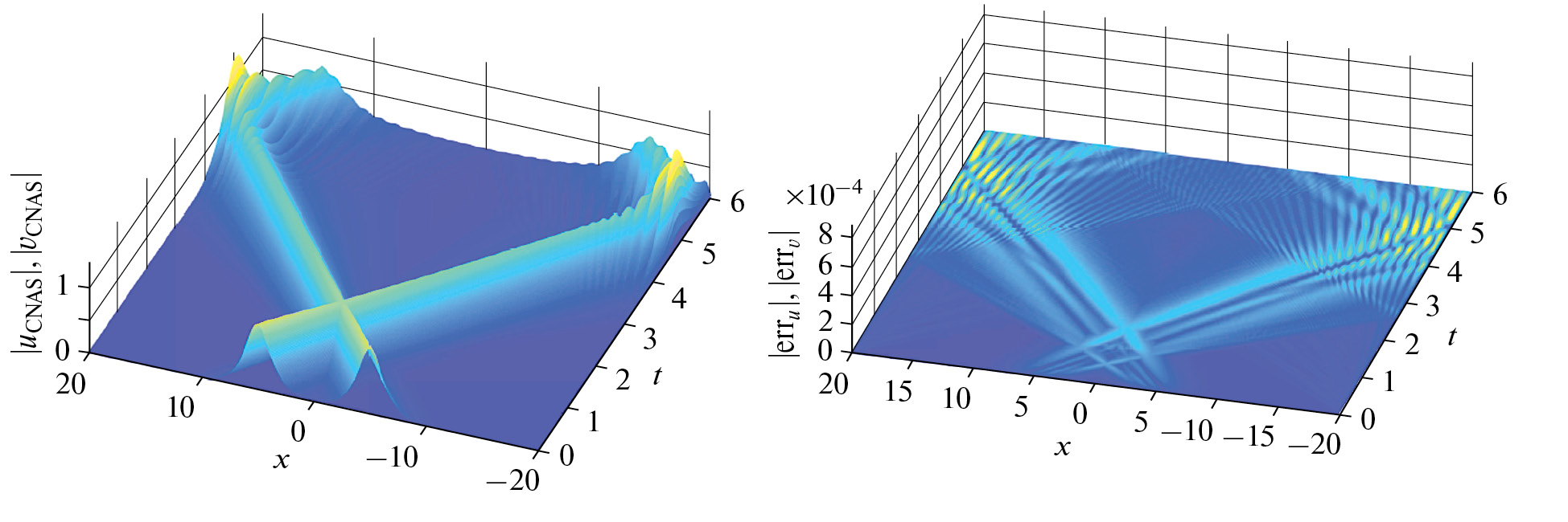 Рис. 17. Численные решения (слева) и их ошибки (справа) дробно-пространственных уравнений CNLS (5.3) при α = 2, M = 800, N = 600