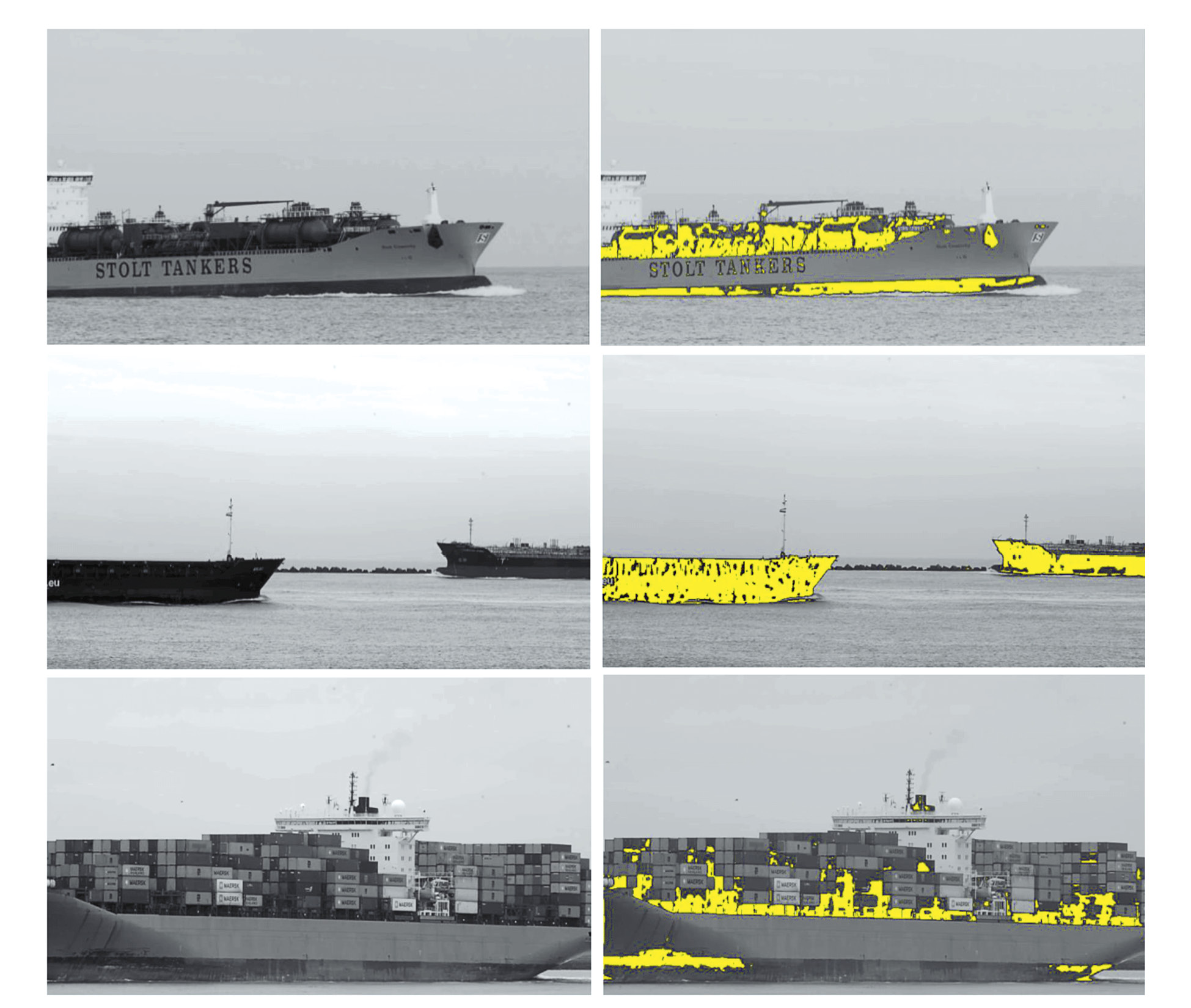 Рис. 10. Примеры движущихся областей изображения (слева) и движущихся областей, потенциально принадлежащих судну и его палубным конструкциям (справа)
