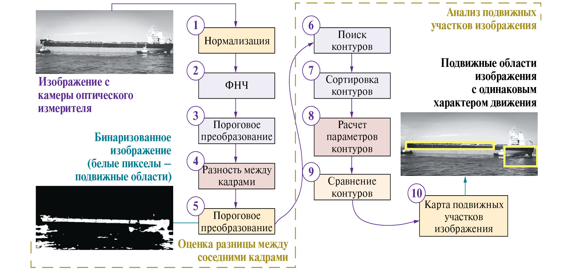 Группы пикселей, выделенные на первом этапе, двигаются с разной скоростью: часть пикселей не сдвигается дальше своего участка изображения (как правило, эти области принадлежат таким объектам, как бакены, буи, волны) и характер их движения определяется как движение в окрестности заданного центра; некоторые пиксели пропадают от кадра к кадру и появляются снова со смещением; и пиксели, которые смещаются постоянно и имеют четко отслеживаемую траекторию движения. Последняя группа пикселей в соответствии с характером движения может принадлежать судну или его палубным конструкциям.