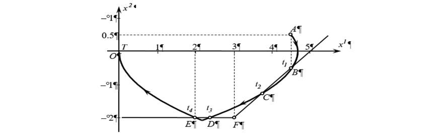 Значит, , поскольку состояние системы в момент находится на прямой . Фазовая траектория , соответствующая управлению и проходящая через точку , имеет вид . Она начинается в точке и заканчивается на прямой в точке . Время движения по этому участку .