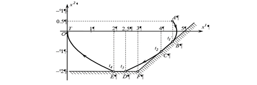 Таким образом, предполагаем, что движение системы на промежутке происходит по следующему плану: при система движется “свободно” (без активных фазовых ограничений); при система перемещается по прямой , при происходит “свободное” движение; при – передвижение по прямой ; при движение системы опять “свободное”. Моменты переключений удовлетворяют неравенствам