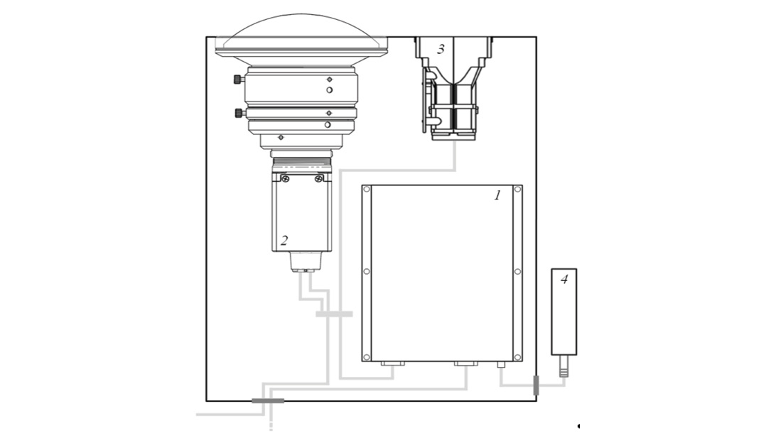 Рис. 1. Схема управляющего оптического измерителя: компьютер (1), камера компьютерного зрения с объективом (2), лазерный дальномер (3), антенна 3G/4G (LTE) (4).
