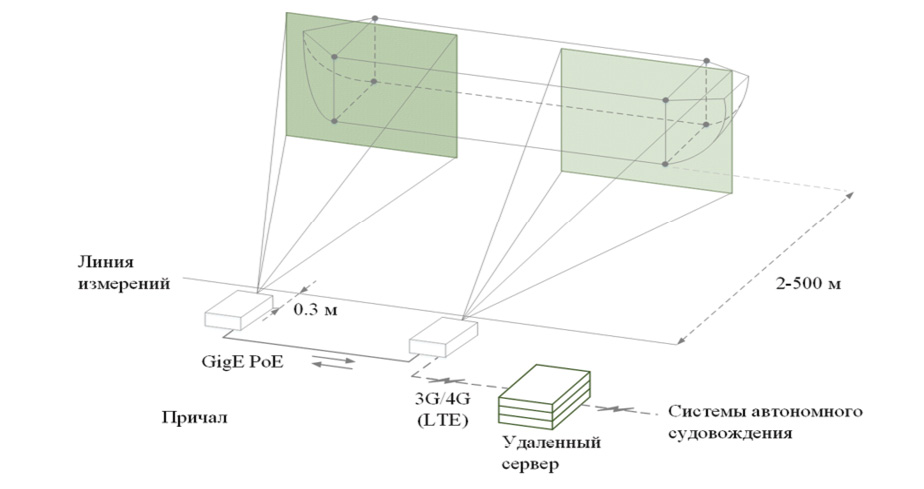Величины поперечного смещения носа и кормы судна относительно причала измеряются лазерным дальномером. На основе поперечного смещения с применением алгоритмов компьютерного зрения рассчитываются величины смещения носа и кормы судна по вертикали и горизонтали.