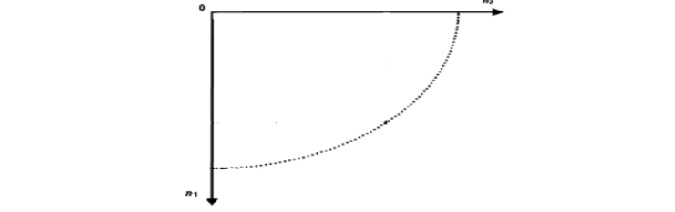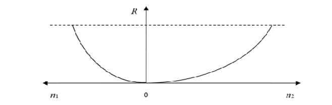 На рис. 4 приведено графическое отображение этой зависимости только для одного фиксированного значения тяги R, где ему соответствует совокупность всех точек n1 и n2, т. е. четверть эллипса.