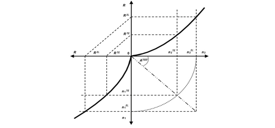 При этом n1TE/n2TE = tg(АTEST) = n1BL/n2BL, т. е. n2BL = n1BL/tg(АTEST), поскольку АTEST – это угол между осью координат [0, n1) и проекциями векторов с координатами [n1, R, n2] на плоскость (n1,0, n2) в трехмерной системе координат “n1–R–n2”, значения которого зависят от значения частот вращения роторов: