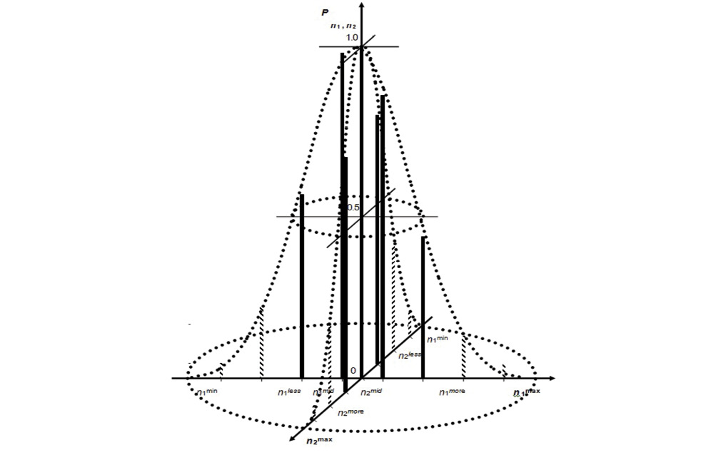 Рис. 7. Трехмерный график вероятностного распределения контролируемых значений частот вращения РНД и РВД ТРДД одной серии относительно их математических ожиданий n1mid и n2mid.