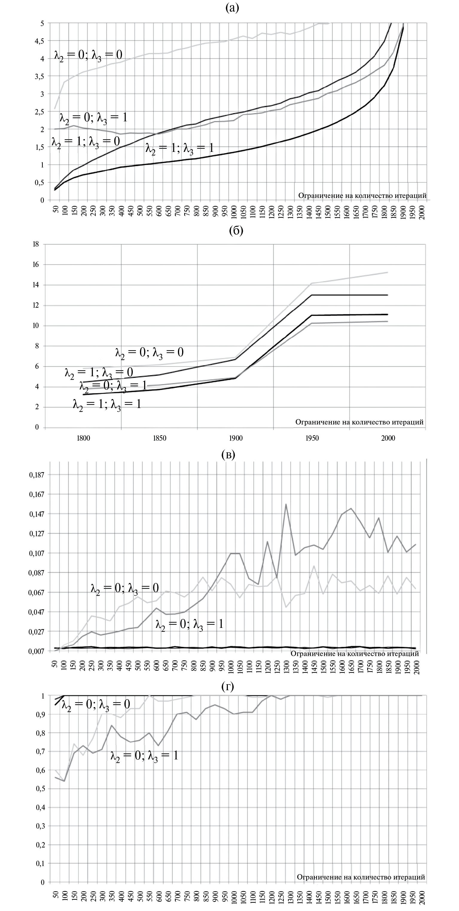Рис 3. Оценки статистических параметров при изменении параметров 1, 2, 3 и ограничения на максимальное количество итераций: а, б – оценка математического ожидания количества дополнительных итераций на одного агента, в – оценка математического ожидания номера решения, на которой были найдены оптимальные значения параметров, г – оценка вероятности найти оптимальное решение.
