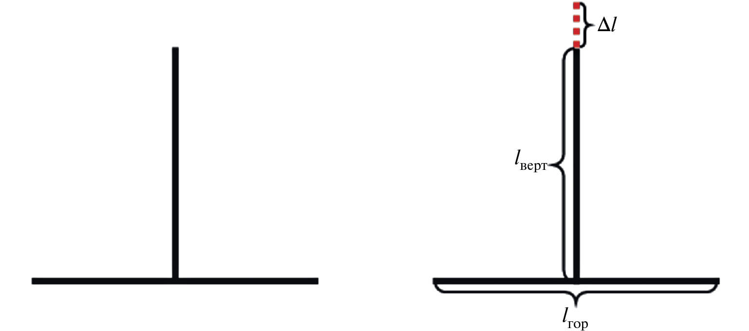 Вертикально-горизонтальная иллюзия проявляется в субъективно неверной интерпретации длины вертикального отрезка, относительного горизонтального (рис. 1). При попытках уравнять длину lверт вертикального отрезка с длинной lгор горизонтального возникает систематическая ошибка (рис. 2):