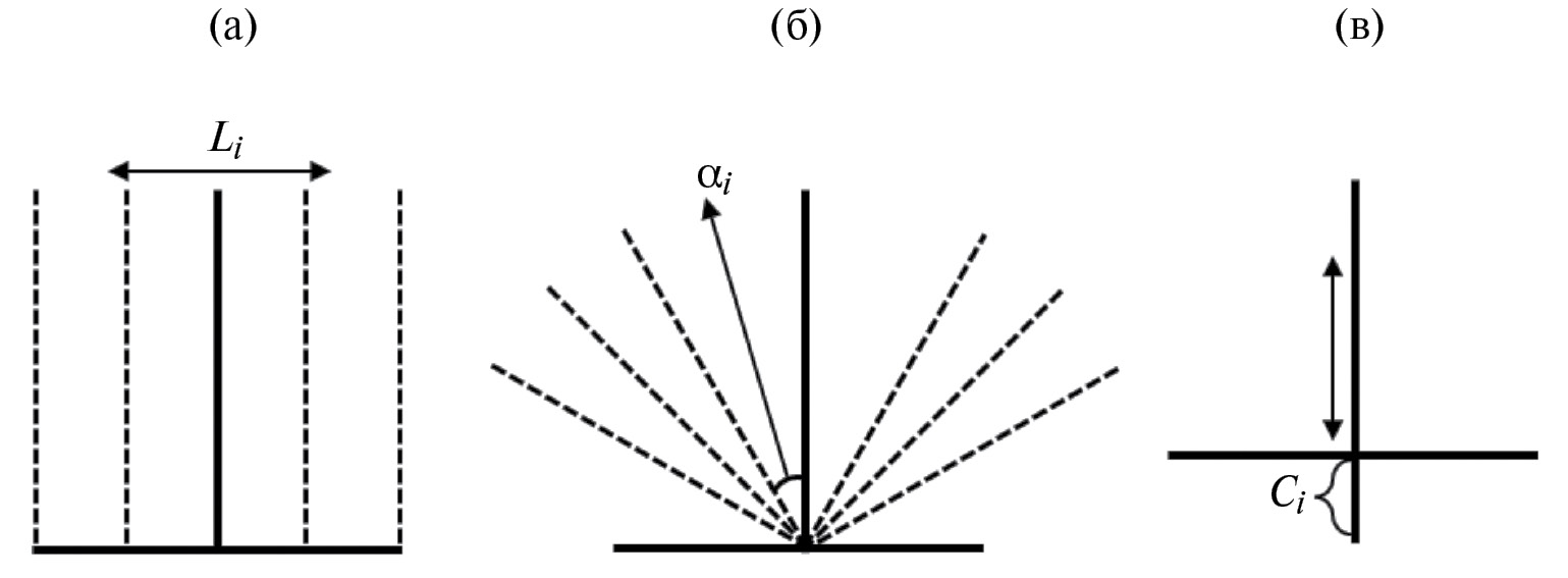 Рис. 3. Вариации геометрических параметров тест-объектов: а – местоположение вертикальной линии относительно горизонтальной; б – угол наклона вертикальной линии; в – длина пересечения вертикальной линии с горизонтальной.