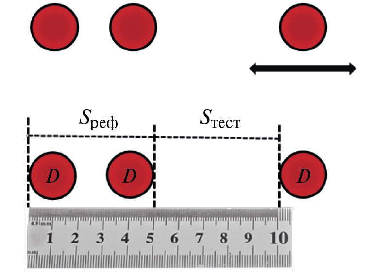 Для демонстрации эффекта иллюзии расстояния между краями объектов выбраны относительно простые геометрические фигуры – окружности (рис. 4). Иллюзия проявляется в неправильной оценке референтного расстояния Sреф между внешними краями первой и второй окружности относительно тестового расстояния Sтест между внутренними краями второй и третьей окружности. Ошибка расстояния задается следующим выражением: