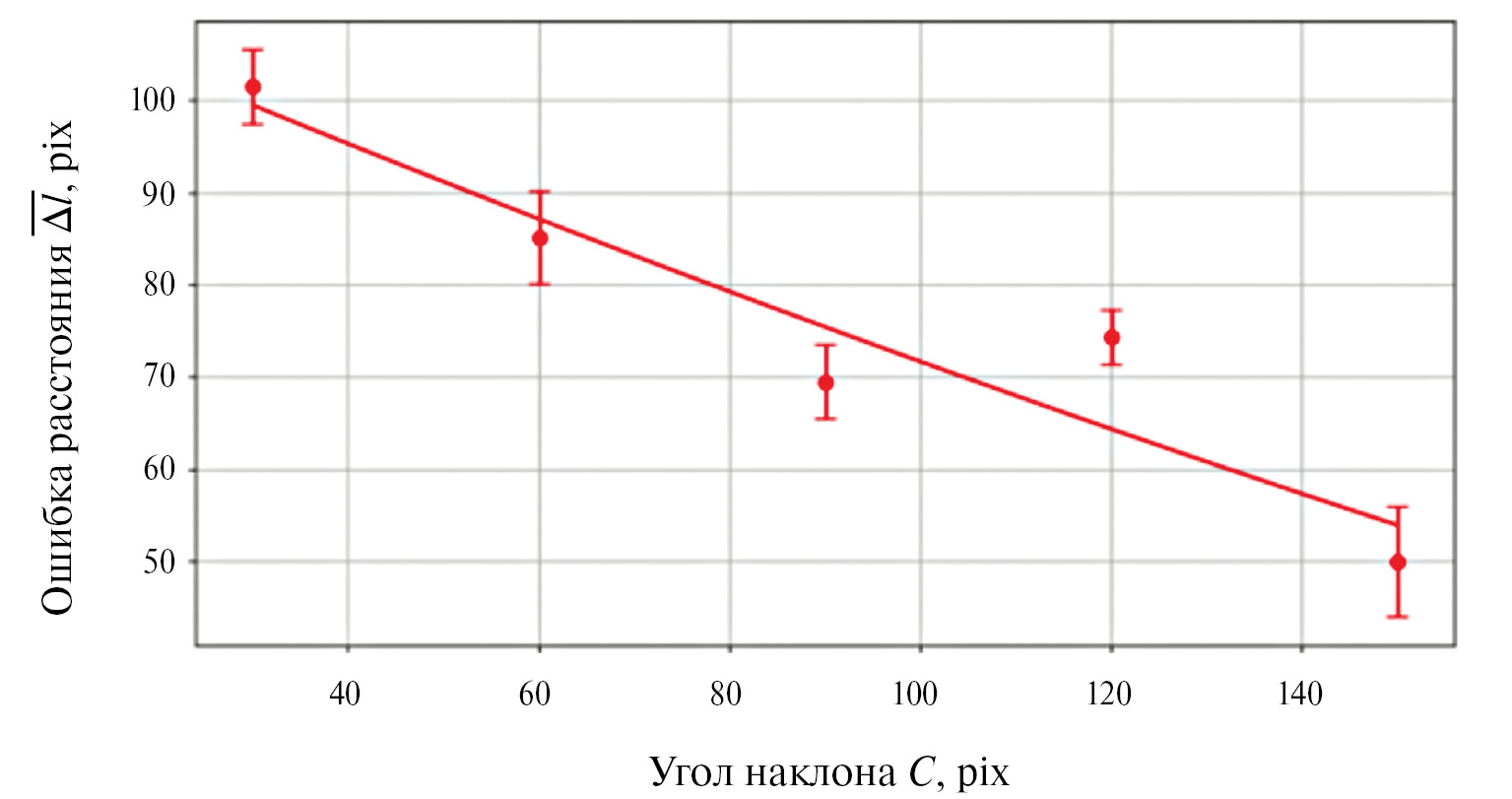 На рис. 9 представлен график зависимости ошибки от длины пересечения C вертикальной линии относительно горизонтальной. Результат свидетельствует об обратно пропорциональной зависимости иллюзии и описывается линейным уравнением следующего вида: