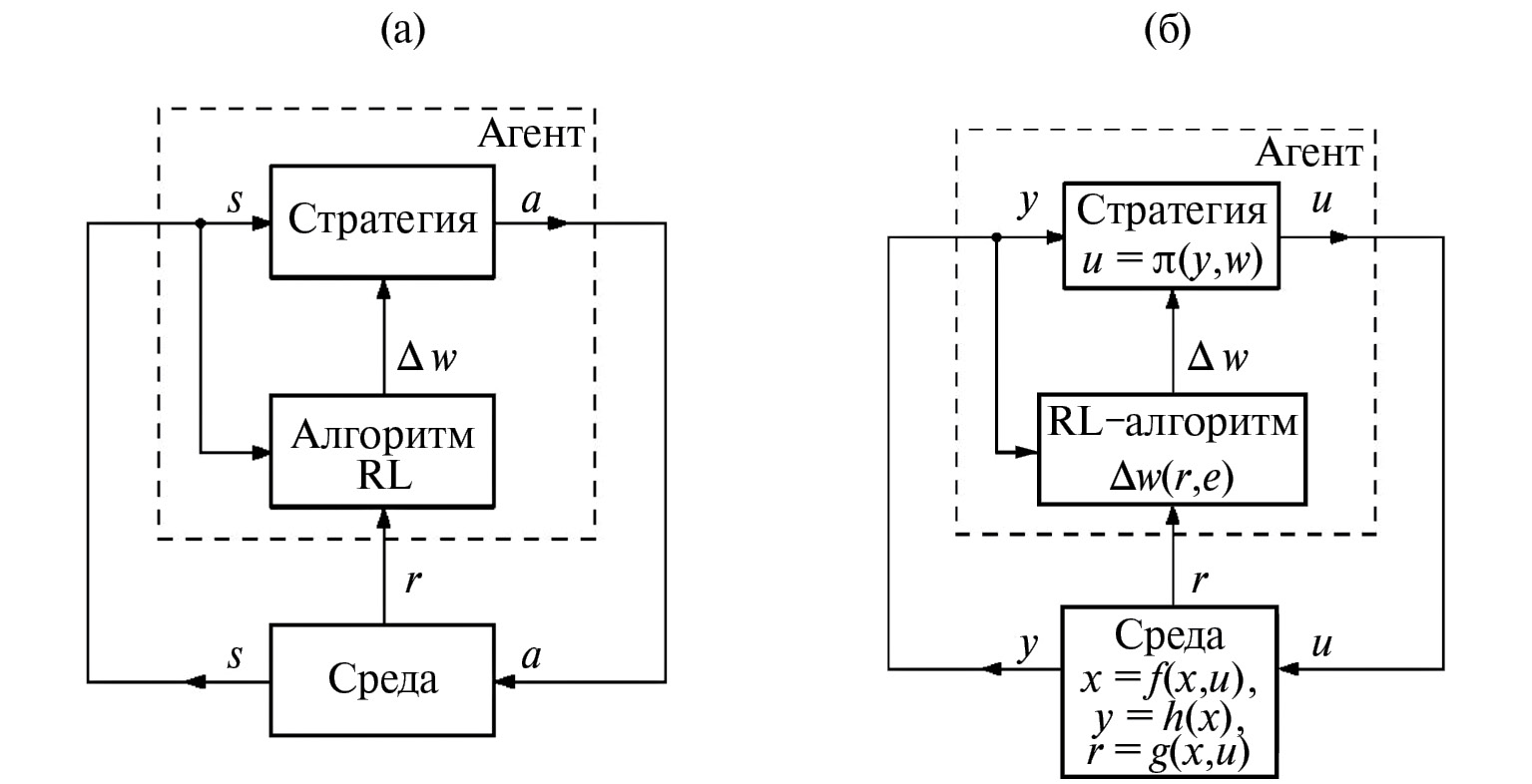 Общая схема обучения с подкреплением для некоторой системы показана на рис. 1а [32–34]. Стратегия (policy) для этой системы определяется как отображение : S → A. Система в терминологии RL-подхода носит наименование “агент” (agent). В некоторый момент времени t агент находится в состоянии st ∈ S. Он воспринимает сигнал вознаграждения rt и предпринимает действие at ∈ A, определяемое стратегией p, т.е. at = p(st). В результате переходит в некоторое следующее состояние st +1 = F(st, at), получая при этом сигнал вознаграждения rt +1 = r(st, at, st+1) ∈ R. На рис. 1б дается вариант общей RL-схемы применительно к задаче управления динамическими системами. Стратегия в системе является параметризованной. Как правило, в ADP-подходе стратегия реализуется в виде нейронной сети прямого распространения. В таком случае настраиваемые параметры w этой сети (синаптические веса и смещения) корректируются в процессе ее обучения, в том числе и при необходимости подстройки закона управления под изменившуюся динамику объекта. Эти корректировки Dw выполняются соответствующим RL-алгоритмом.