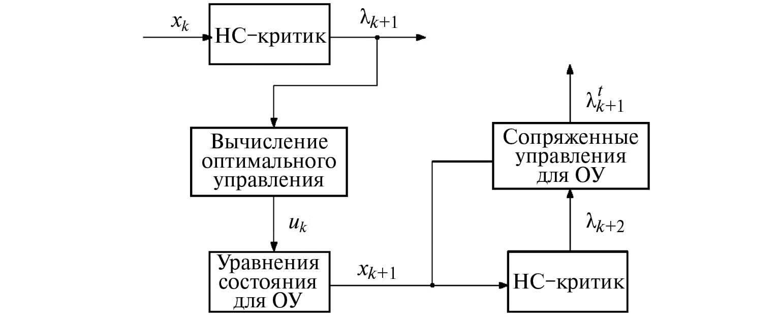 Оба упомянутых выше элемента (критик и актор), присутствуюшие в большинстве схем ACD, реализуются чаще всего в виде нейронных сетей прямого распространения. Существует, однако, ACD-схема, в которой имеется только критик – схема SNAC (single network adaptive critic) [16–21]. Формирование управляющего сигнала в схеме SNAC вместо актора осуществляется с помощью оптимизационного алгоритма, основанного на соотношениях для линейно-квадратичного регулятора.