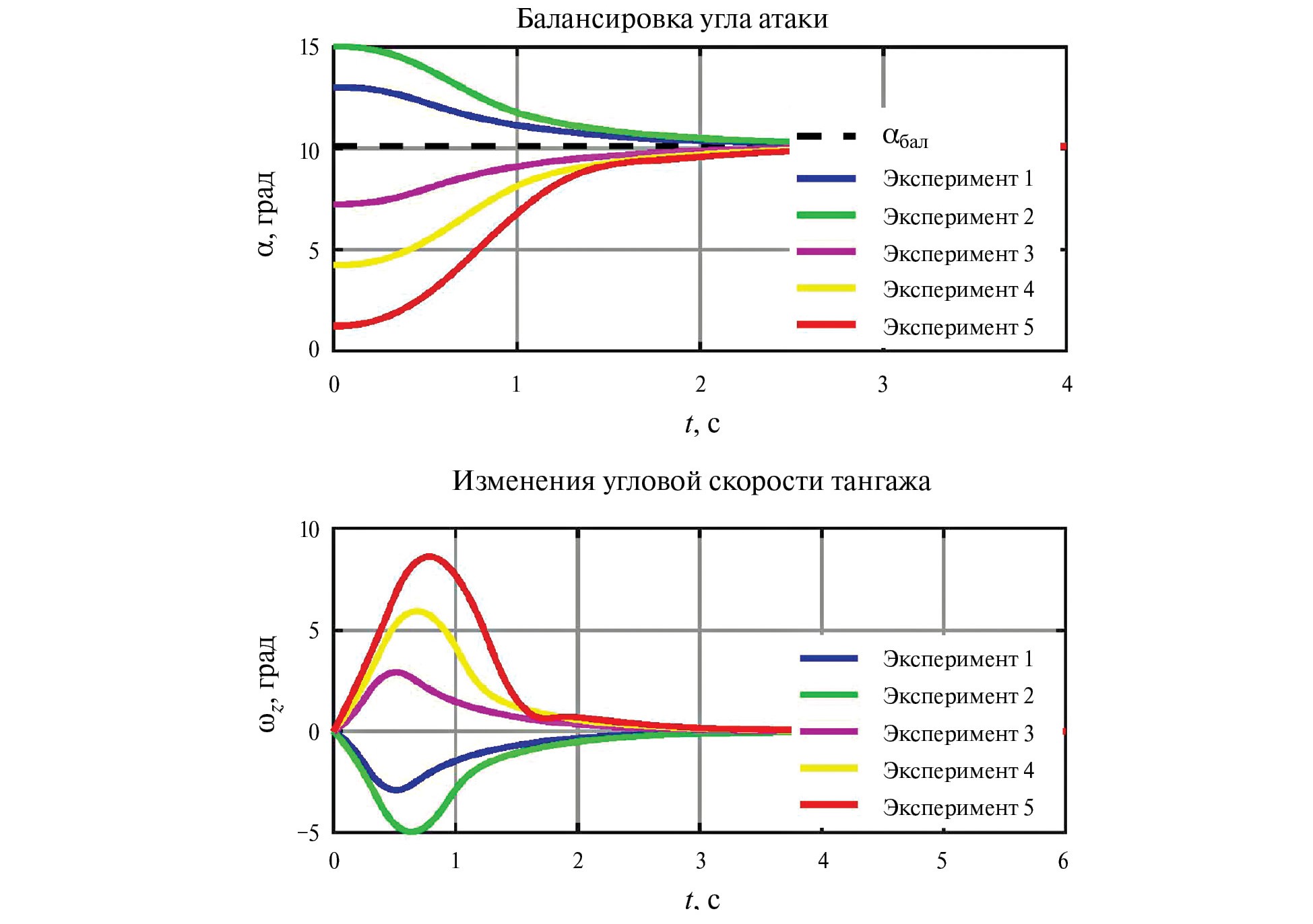 Полученные результаты позволяют сделать следующие выводы. Совместное применение динамической инверсии и SNAC-технологии позволило успешно решить поставленную задачу синтеза отказоустойчивого регулятора угловой скорости тангажа для СПС. При этом использование динамической инверсии упрощает процесс настройки SNAC. Что касается воздействия комбинации DI+SNAC на значения переменных состояния в проводившихся экспериментах, то здесь можно отметить следующее. При отработке задающего сигнала по углу тангажа (переход из состояния = 0 в состояние = 5°) выход на требуемое значение происходит менее чем за 3 с, перерегулирование отсутствует. Для исходных данных, приведенных в табл. 1, была решена также задача перехода СПС к балансировочному значению угла атаки, равному a = 10.12°. Регулятор, сформированный по схеме DI + SNAC, успешно справляется и с этой задачей. Колебания по углу атаки подавляются, время выхода на балансировочное значение не превышает 3 с, хотя начальные отклонения от этого значения в ряде экспериментов были значительными, как это видно из табл. 1. Лишь в эксперименте с самым большим отклонением от балансировочного значения появляется небольшая колебательность по угловой скорости тангажа. В целом полученные результаты являются вполне приемлемыми для ЛА рассматриваемого вида.