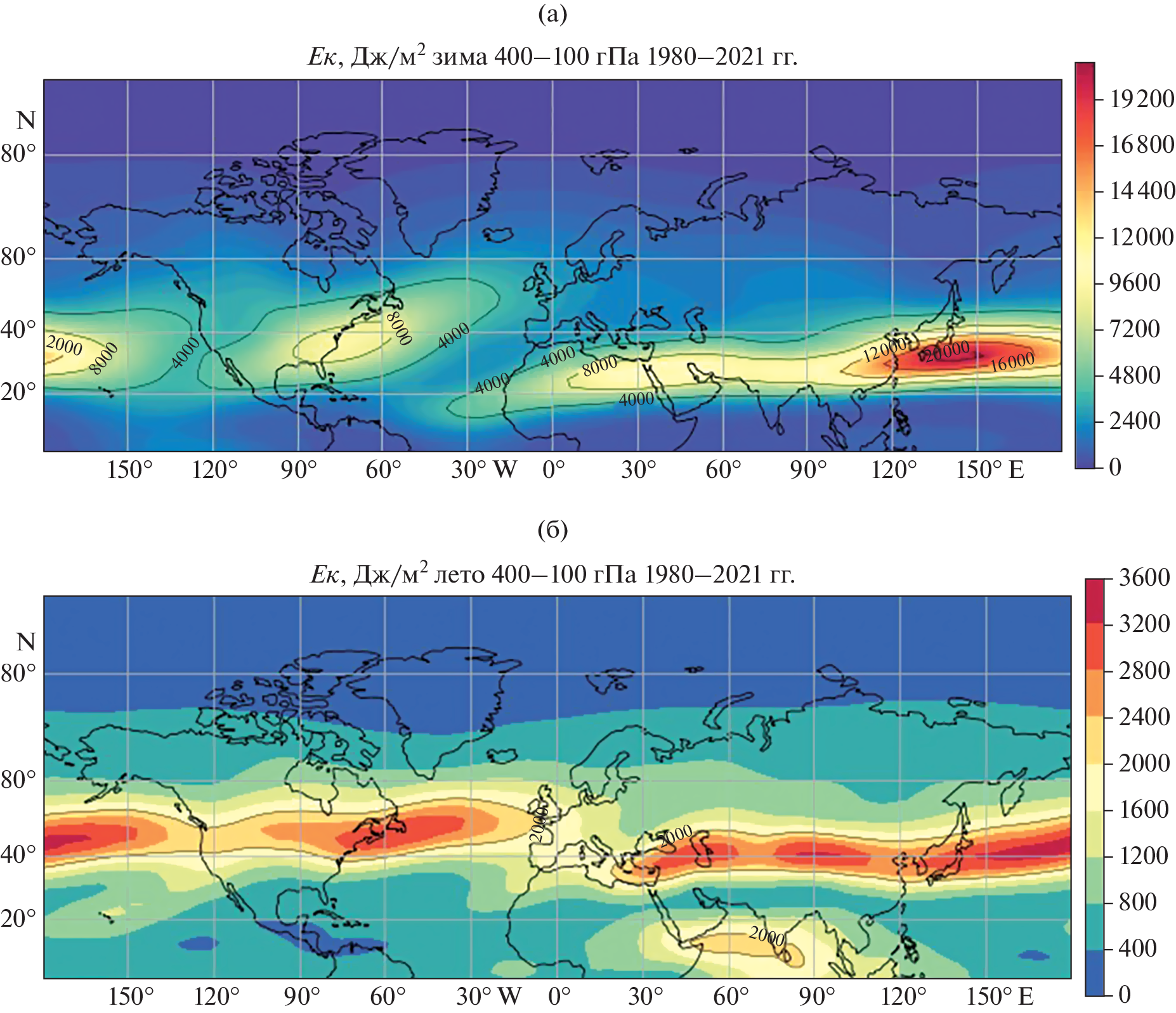 Based on the reanalysis data quantitative estimates of the kinetic energy of the high-altitude jet streams of the Northern Hemisphere (EK JS NH) and its changes in the annual cycle and interannual variability for the period 1980–2021 were obtained under different conditions for the minimum wind speed Vm in the JS area. Adequate estimates are made for the share of the total kinetic energy of the atmosphere of the Northern Hemisphere associated with JS (PEк JS). The share of the volume of atmospheric layers in the JS area in the NH in the total analyzed atmospheric layer of 500–100 hPa (PV JS) was also estimated. Significant changes were noted in summer including significant weakening trends of EК, PEк and PV in July and August at Vm ≥ 20 and Vm ≥ 30 m/s. In winter significant changes were noted only for PV – a decreasing trend at Vm ≥ 20 and Vm ≥ 30 m/s. Seasonal features of JS connection with El Niño phenomena are noted which are most significantly manifested from January to April.
