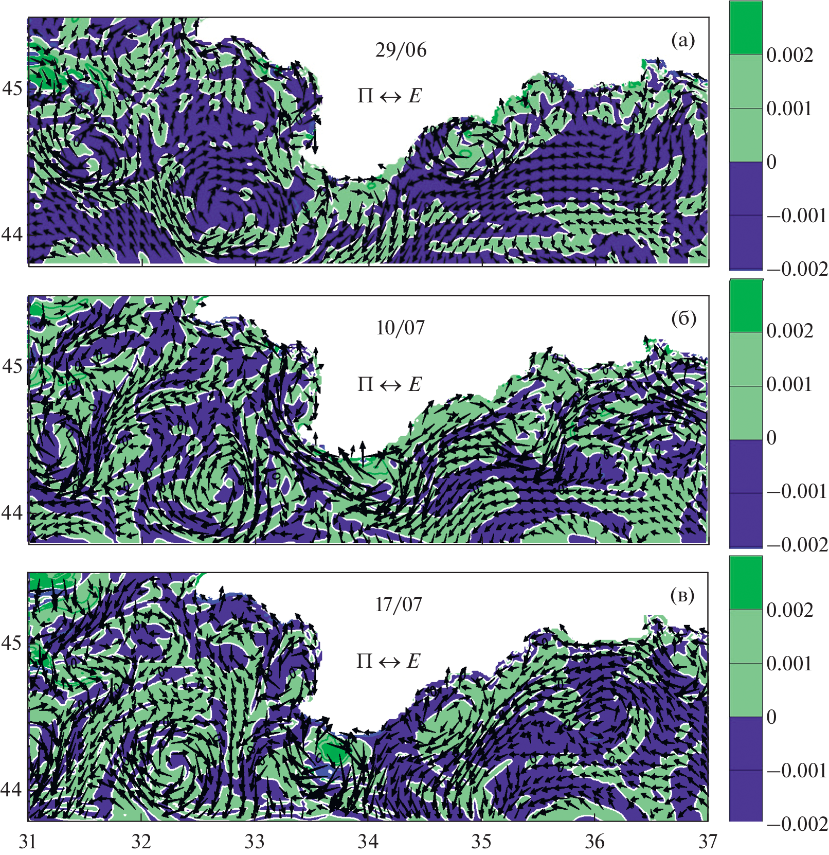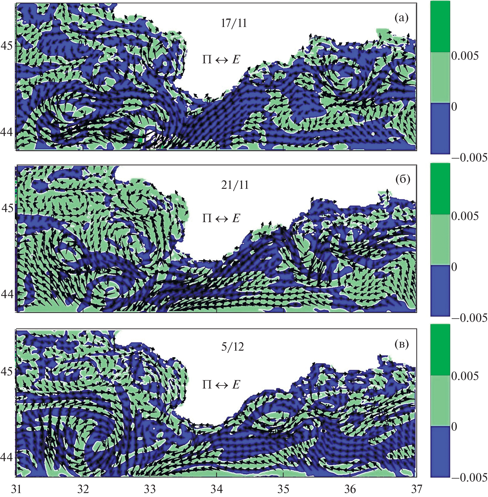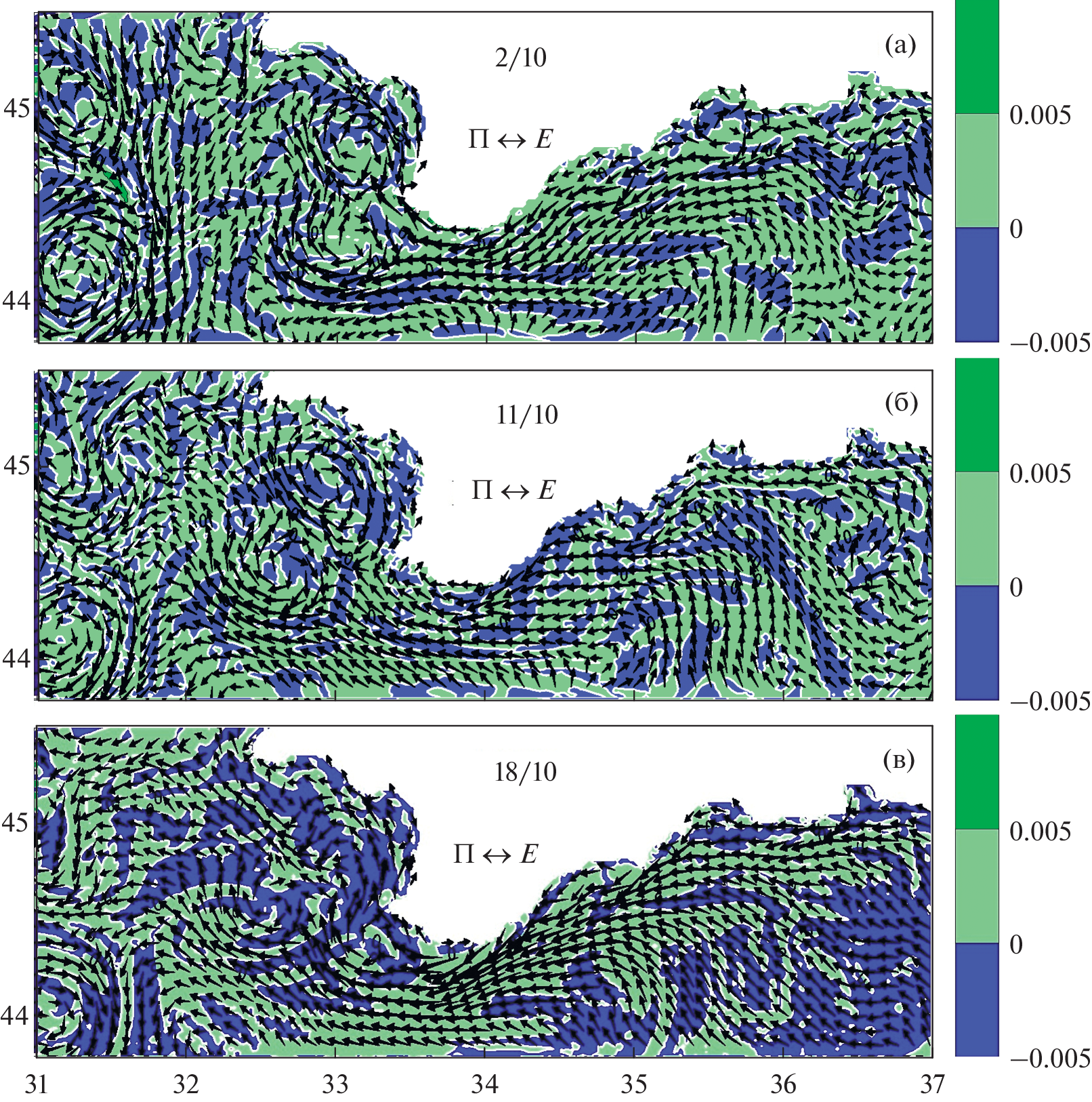 The analysis of the dynamic and energy characteristics of water circulation in the northern part of the Black Sea was performed on the basis of the assimilation in the numerical model of the data of three hydrological surveys in 2016, carried out on expeditions of 87, 89 and 91 cruises of the R/V Professor Vodyanitsky (summer, autumn and autumn-winter seasons). Numerical experiments were implemented on a horizontal grid (~1.6 km × ~1.6 km) with 27 vertical horizons and an atmospheric effect close to the real one was used. A procedure of assimilation of the observational data was based on the Kalman filter, taking into account the heterogeneity and nonisotropy of the errors of the estimates of the temperature and salinity fields. The integral energy terms in the kinetic and potential energy budget equations for three seasons were estimated. In the summer season, there was a slight weakening of the RC and the main mechanism for the formation of anticyclonic eddies near Sevastopol and near the southeastern shores of Crimea was baroclinic instability of the current (as evidenced by the increase in the slope of isopycnical surfaces and negative values of the work of the buoyancy force). An anticyclonic eddy near Yalta with a radius of about 25 km was generated due to the development of shear instability of the current. In the autumn season, the RC jet was pressed to the shore and there was a decrease in the number of eddies in comparison to the summer season. The formation of anticyclonic eddies with a radius of about 35–40 km in the western part of the region was caused by barotropic instability of the current, the formation of eddies along the Crimean coast – by baroclinic instability. In the autumn-winter season, the RC had a pronounced jet character and there was an increase in the processes of baroclinic instability with the generation of eddies of different scales between the coast and the RC, as well as in the area, located between 31.5 and 33° E, with the weakening of the wind effect. During all seasons, small-scale anticyclonic and cyclonic eddies could be generated along the western and eastern coast of Crimea in the upper layer when current flowed around the coastline and inhomogeneities of the bottom topography under the action of weak winds.