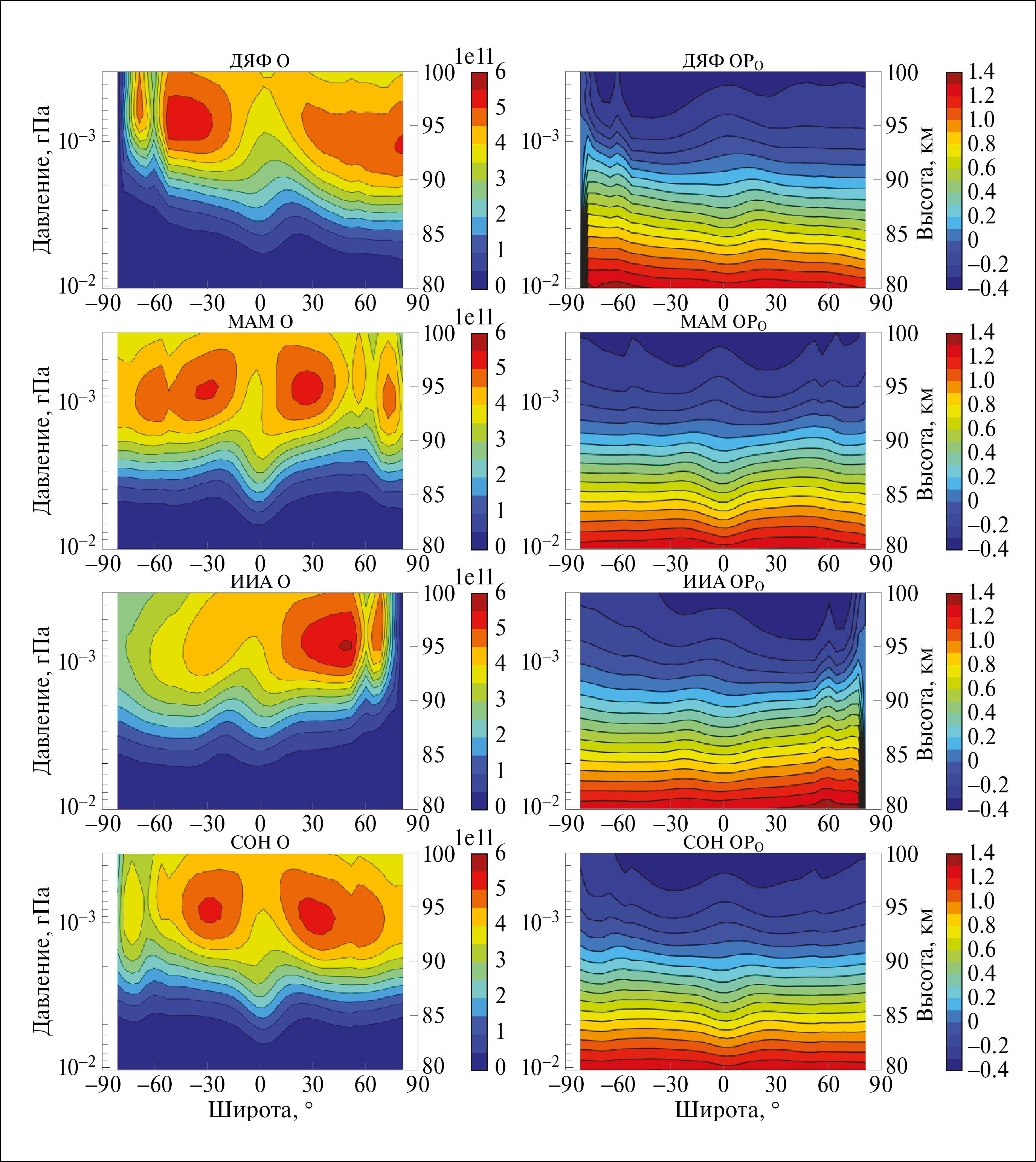 На рис. 1 представлены полученные распределения О и относительной разницы в зависимости от сезона. Можно видеть, что (1) в весенне-осеннее время характерны 2 основных пика концентрации О, лежащие вблизи границы низких и средних широт каждого полушария, (2) в зимне-летнее время эта симметрия разрушается, пик в летнем полушарии становится главным, он сдвигается к полярным широтам, именно здесь наблюдается абсолютный максимум концентрации О (~6 ∙ 1011 см–3). Относительная разница является заметной во все сезоны. Можно видеть, что только в районе 90–93 км не превышает ~±0.2. Выше этого диапазона высот уменьшается до –0.4, а выше – монотонно возрастает с уменьшением высоты во все сезоны и на всех широтах, достигая ~1.4 на 80 км. Таким образом, можно заключить, что новые параметры процедуры восстановления приводят к значительному возрастанию концентрацию О ниже 90 км и заметному ее уменьшению вблизи 100 км.