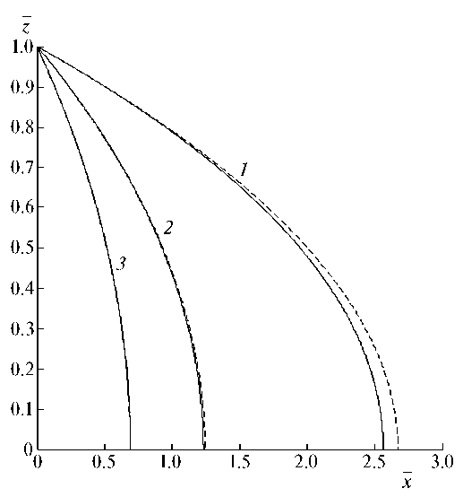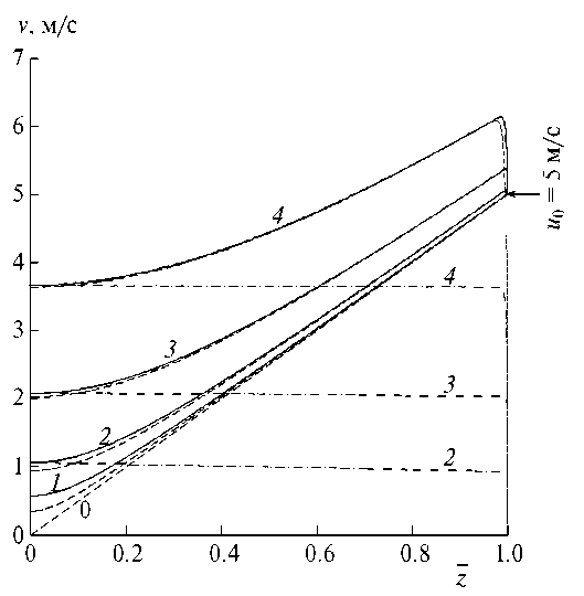 На рис. 2 показана зависимость модуля вектора скорости капли от безразмерной вертикальной координаты (здесь и далее сплошные и штриховые кривые соответствуют наличию и отсутствию захвата частиц каплей). Видно немонотонное поведение изучаемой зависимости. Сначала вблизи точки старта капли ( = 1) она резко увеличивается. Это связано с тем, что вертикальная составляющая скорости w по абсолютной величине растет быстрее, чем горизонтальная составляющая u падает (вследствие падения по z, а u, как отмечено выше, слабо отличается от U1). Затем после достижения максимального значения скорость капли по мере дальнейшего ее движения ( < 1) постепенно уменьшается до определенного минимального значения, достигаемого в точке падения на поверхность земли ( = 0) и зависящего от начального размера капли. Это объясняется тем, что после достижения установившегося значения вертикальная составляющая скорости по мере движения капли практически не меняется, а горизонтальная составляющая при этом уменьшается, так что результирующая скорость капли v в целом также уменьшается. Следует заметить, что с ростом размера капли ее максимальная скорость увеличивается, также увеличивается и минимальная скорость, достигаемая в точке падения на землю ( = 0). С уменьшением размера капли немонотонность поведения зависимости v() ослабевает (например, для диаметра капли < ~ 250 мкм данное свойство на рис. 2 малозаметно). Наличие захвата частиц каплей приводит к повышению скорости капли, хотя этот эффект с ростом размера капель ослабевает, и при диаметре капли 1000 мкм он почти незаметен.