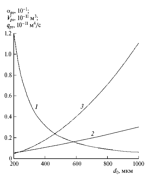 Рис. 5. Зависимости предельной объемной доли αps, объема Vps твердого компонента в составе капли и интенсивности выпадения частиц на поверхность земли qps от размера капли: 1 – αps, 2 – Vps, 3 – qps.