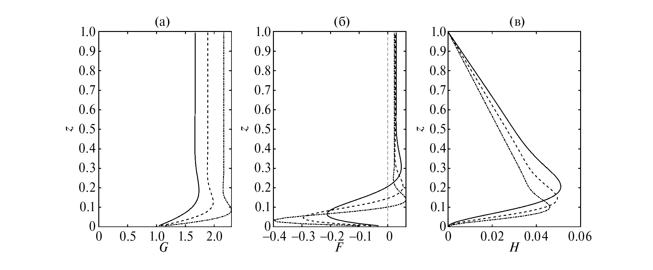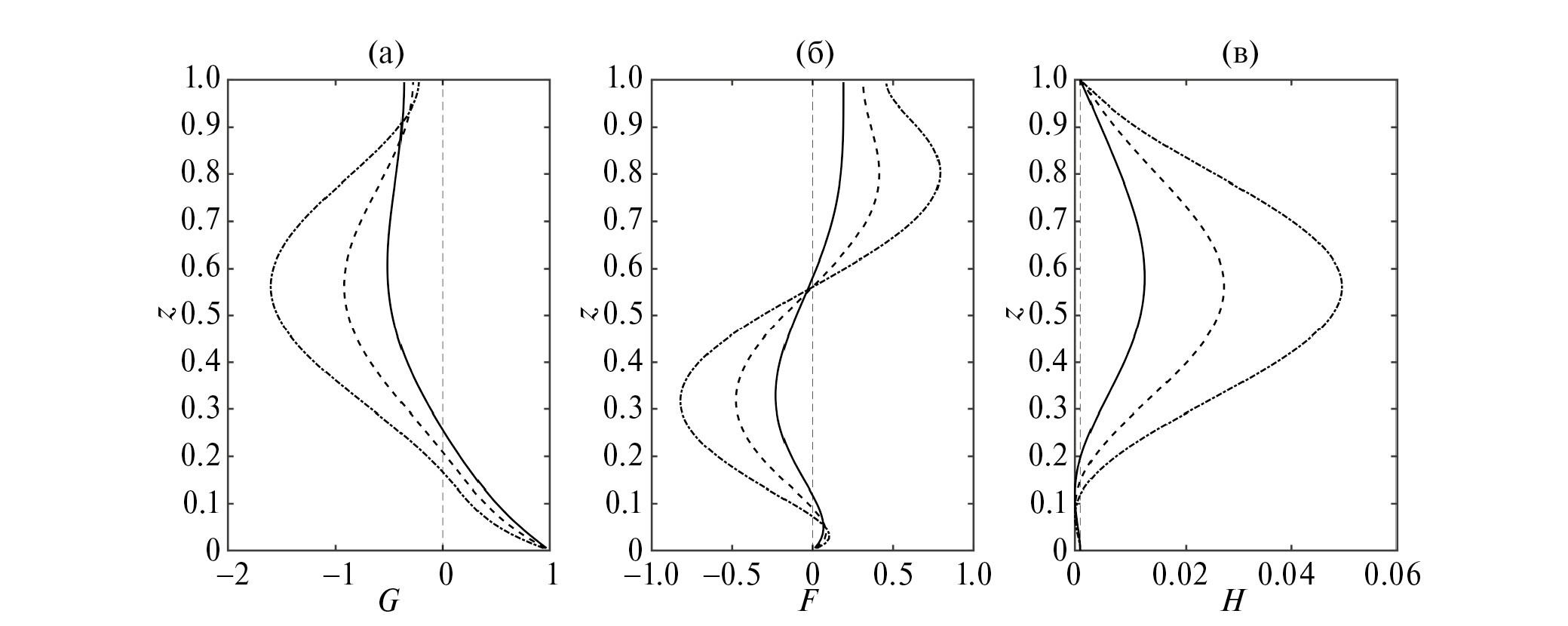 Рис. 2. Профили стационарного численного решения при разных значениях числа Экмана (E=1/100 – сплошная линия, E=1/200 – штриховая, E=1/400 – штрих-пунктирная). Q=1.0, S=1. Вертикальная тонкая пунктирная линия – нулевое значение.