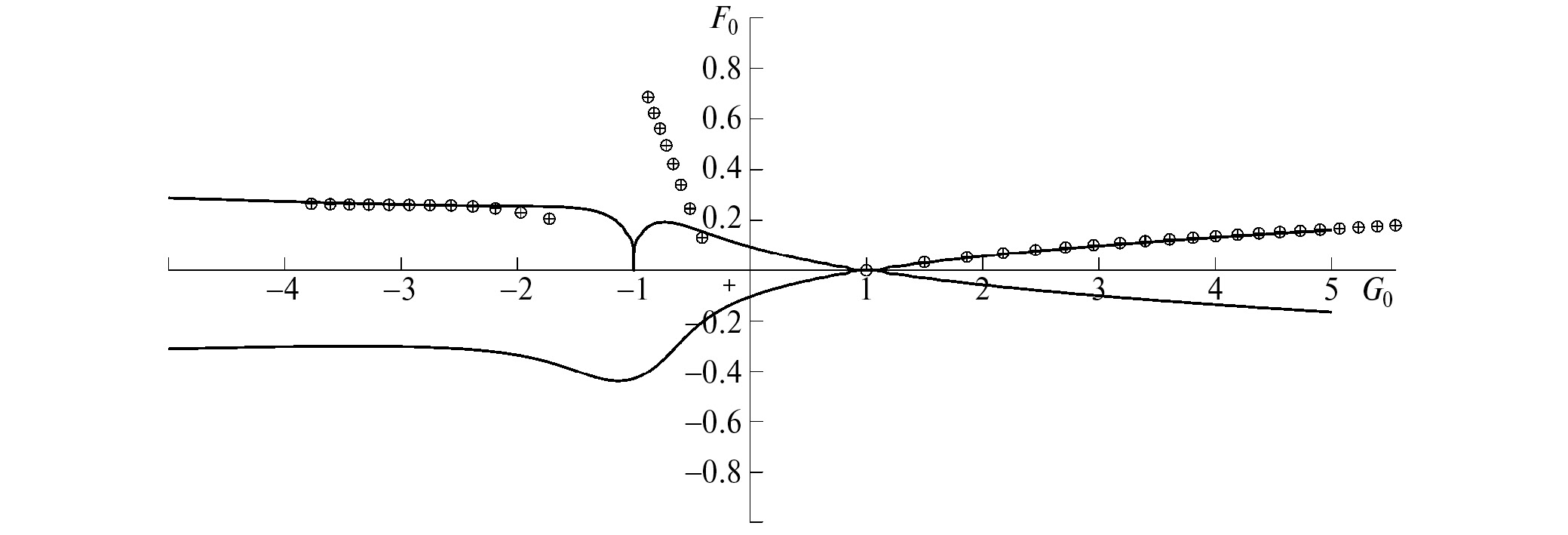 Рис. 4. Изолинии, соответствующие решению уравнения (15). Значки – точки параметрической кривой (G(1,Q), F(1,Q)), полученной по данным численной модели при -2≤Q≤2 и разных начальных профилях завихренности (A=-2 – кружки и A=0 – плюсы). E=1/50, S=1.