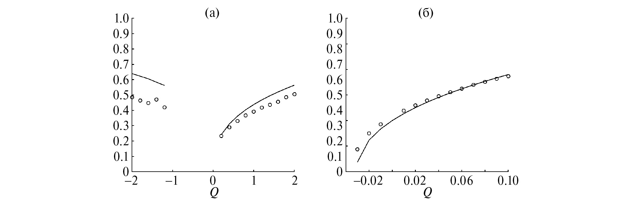 Рис. 5. Зависимость декремента затухания по данным численной (сплошная линия) и теоретической (кружки) моделей от параметра Q: (a) -2≤Q≤2, (б) -0.03≤Q≤0.1. E=1/100, S=1.