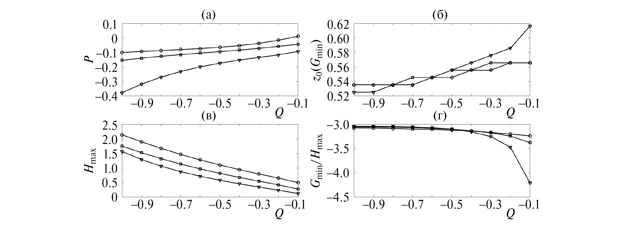 Рис. 6. Зависимость характеристик стационарного решения в режиме Стюартсона от параметров Экмана и величины форсинга Q: (a) координата максимума вертикальной скорости, (б) координата минимума завихренности, (в) максимальное значение H(z), (г) отношение минимального значения G(z) к максимальному значению H(z)·E=1/100 – треугольники, E=1/200 – квадраты, E=1/400 – кружки.
