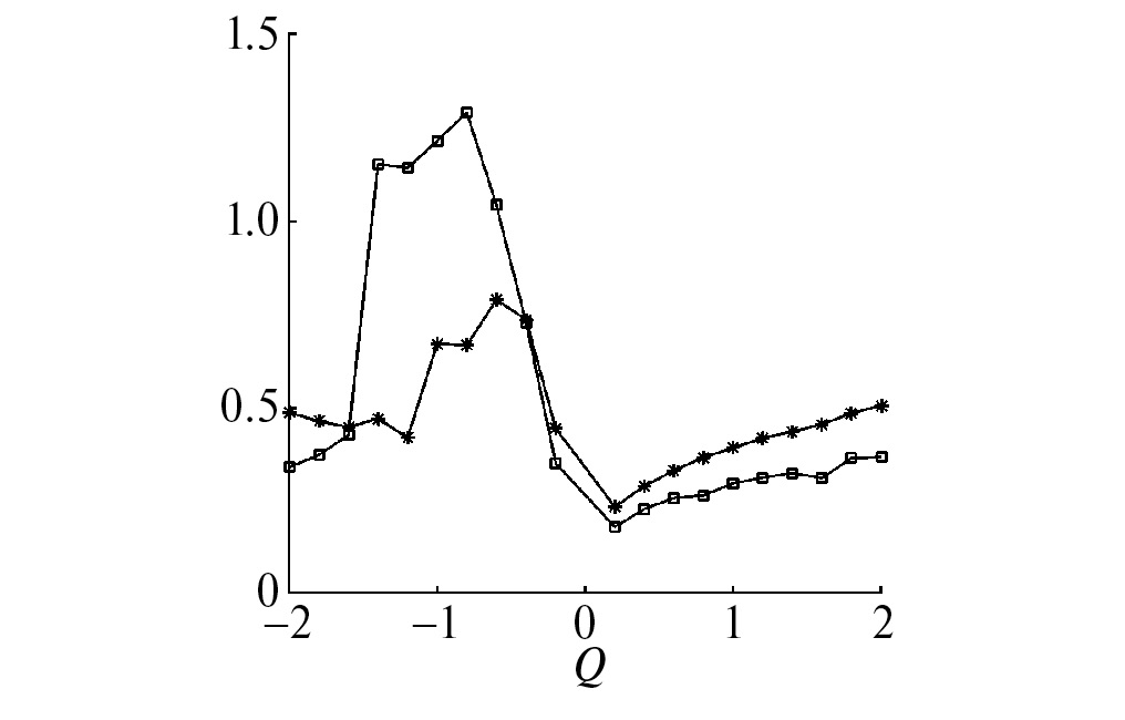Рис. 7. Декремент затухания завихренности на поверхности по данным численной модели при разных значениях параметра Q· E=1/100 (звездочки), E=1/200 (квадраты).