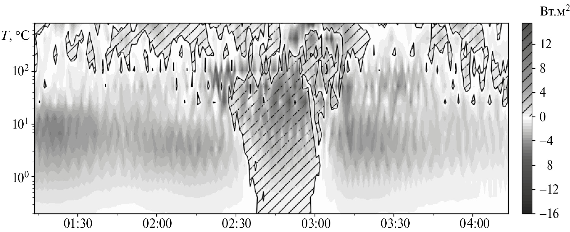 На рис. 2 представлено спектральное разложение потока тепла для рассматриваемого случая. Для наглядного представления изменений спектров со временем, представлены расчёты через каждую минуту (так же, как в работе [Viana et al., 2009]). Каждый спектр рассчитывался по ряду длиной ~ 27 минут (214 точек). До прохождения цуга ВГСВ (до 02:15) поток тепла был отрицателен на всех частотах выше ~ 0.04 Гц (с масштабами менее ~ 25 с). В начале эпизода наблюдался всплеск отрицательных значений потока тепла, с наибольшей интенсивностью на частотах ~ 0.02–0.01 Гц (50–100 с). Вскоре на всех частотах выше ~ 0.01 Гц (менее 100 с) знак потока сменился на положительный. После прохождения цуга ВГСВ поток тепла вновь стал отрицательным, однако, приближался к нулю уже на меньших частотах (~ 0.01 Гц), чем до начала эпизода (~ 0.04 Гц).