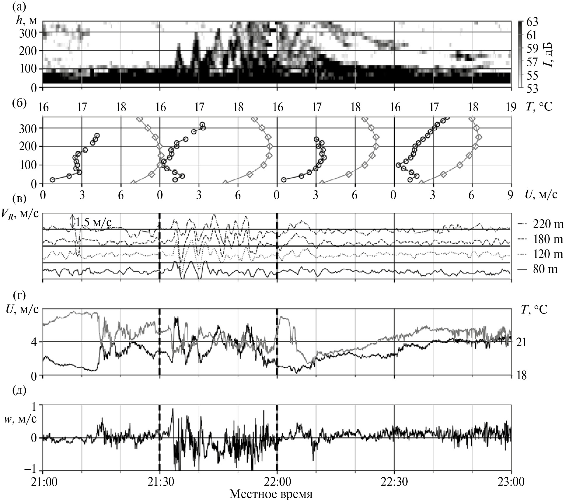 На рис. 4 представлены синхронные измерения, произведённые содаром и соником во время прохождения цуга ВП (11.06.2009). Колебания с периодом 5–6 минут наблюдались с 21:30 до 22:00 на содарной эхограмме, а также во временных рядах горизонтальной и вертикальной компонент скорости ветра, и в измерениях акустической температуры. Началу регистрируемого на эхограмме эпизода предшествовало резкое снижение температуры и усиление ветра (в 20:45–21:15), а также несколько колебаний ветра и температуры (в 21:15–21:30). Число Ричардсона до, во время и после эпизода составляло соответственно ~ 0.22, 0.84, 0.28. Частота Брента-Вяйсяля составляла ~ 2.5 · 10–2 c-1, частота колебаний составляла ~ 3 · 10–3 c-1. Масштаб времени z/u* составил ~ 130 с до начала эпизода и ~ 500 с во время.