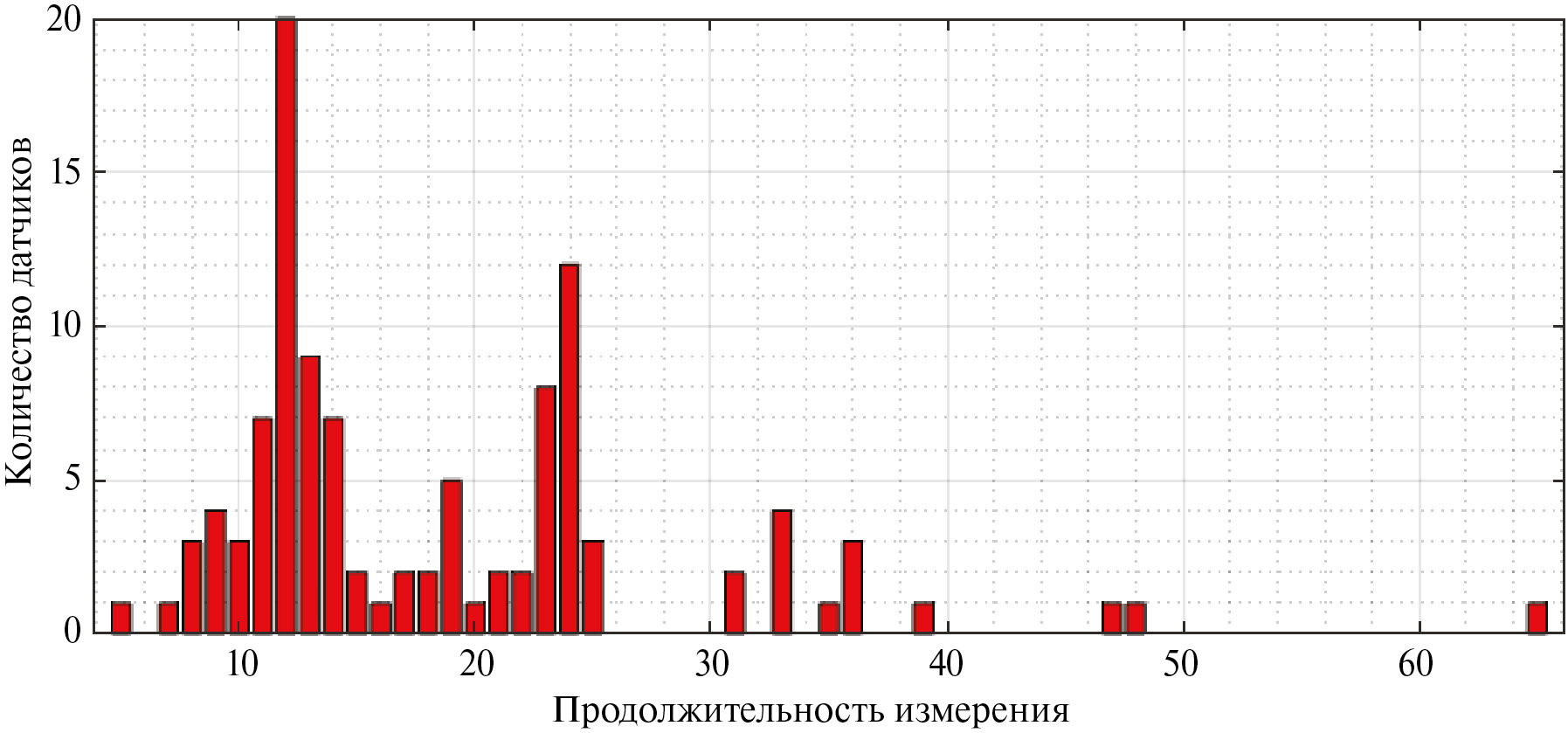 Ниже представлена еще одна гистограмма (рис. 5), на которой можно видеть количество датчиков в зависимости от времени, выраженное в месяцах, которое эти датчики измеряли. Согласно рис. 5, есть два основных пика в районе одного и двух лет, то есть большая часть датчиков была установлена на период либо один год, либо два года, что вероятно обусловлено проведением экспедиций преимущественно в летние периоды Южного полушария. При этом минимальная продолжительность измерения датчика составляет немногим менее 1-го года, а максимальная более 5 лет.