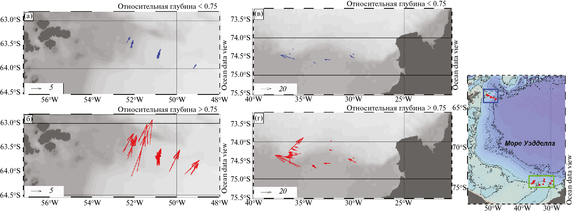 Рис. 9. Карта с указанными осредненными за период измерения значениями скоростей для датчиков на АБС, относящихся к условно верхнему слою (на рисунках a и в, показаны синим цветом) с глубинами до 0.75 H, где H – глубина постановки станции, и для датчиков, размещенных в придонном слое (на рисунках б и г, показаны красным цветом) с глубинами от 0.75 H (нижние 0.25 H водной толщи). Показаны и северо-западная часть моря Уэдделла (а и б) и южная часть (в и г). Справа внизу представлена схема района, на которой синим прямоугольником отмечена северо-западная часть моря Уэдделла, а зеленым – южная часть.