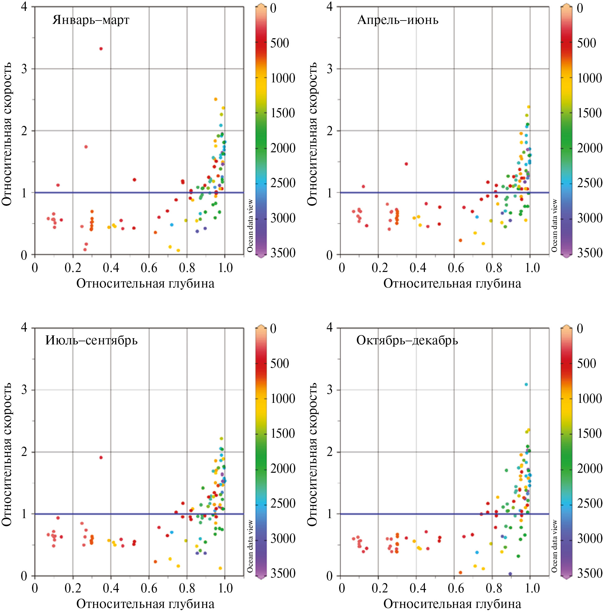 При рассмотрении средних значений скоростей, посчитанные отдельно для каждого сезона, наблюдается аналогичная картина с интенсификацией течения в придонном слое. На рис. 12, аналогичному предыдущему, с относительными значениями средних скоростей по отношению к относительной глубине, но с разделением по сезонам (с января по март, с апреля по июнь, с июля по сентябрь и с октября по декабрь), можно видеть, что ускорение течения в придонном слое примерно в 0.2–0.3 H присутствует во все сезоны, пусть и с некоторыми выбивающимися точками (основное облако точек, лежащее над границей в 1 расположено в придонном слое). Так что, по всей видимости, наблюдаемая придонная интенсификация течений в придонном слое в южной и северо-западной части моря, является характерной особенностью моря Уэдделла и присутствует круглогодично. Явного сезонного хода не наблюдается.