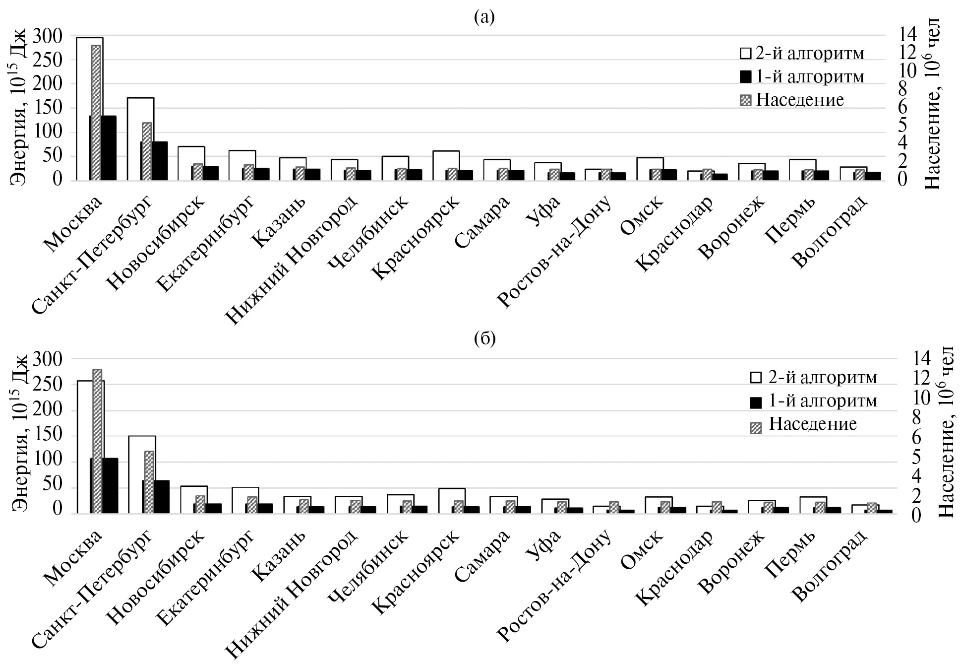 Города с миллионным населением, кроме Москвы и Санкт-Петербурга, в течение отопительного периода при температуре наружного воздуха tнар, равной tот, генерируют антропогенную энергию при расчете по обоим алгоритмам в диапазоне от нижней границы 13.5–20.6 1015 Дж до верхней границы 29.7–70.7 1015 Дж, объединенная Москва производит от 132.1 до 291.4 1015 Дж, а Санкт-Петербург от 79.3 до 171.7 1015 Дж. Заметим, что население Москвы в 2.32 раза больше населения Санкт-Петербург, но при этом Москва создает антропогенное тепло в 1.7 раза больше северной столицы. Такое соотношение можно объяснить тем, что суммарный объем зданий в Москве в 1.7 раза больше, чем Санкт-Петербурге, а отсюда следует, что количество антропогенной энергии, в конечном счете, определяется общим объемом зданий города.