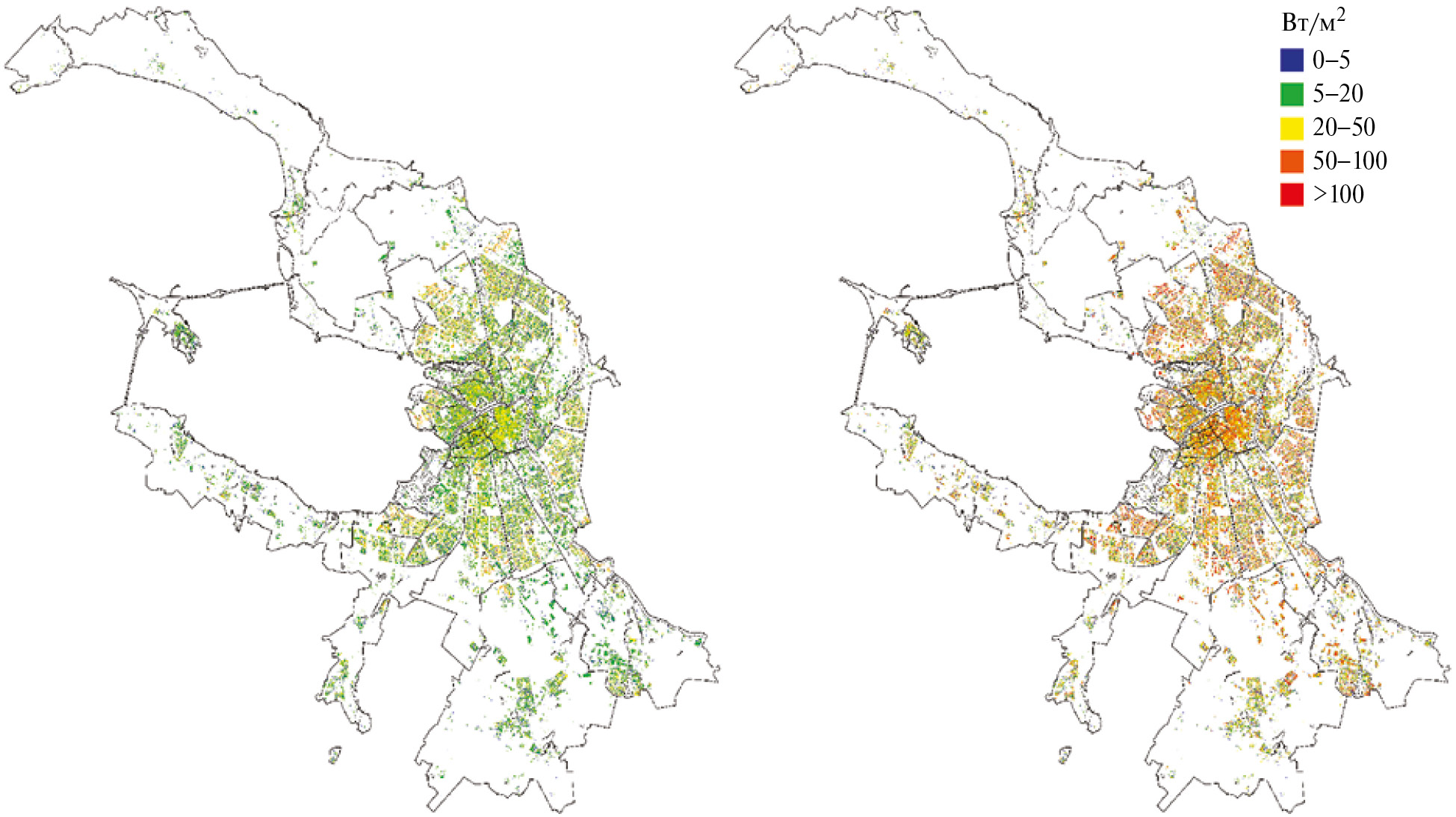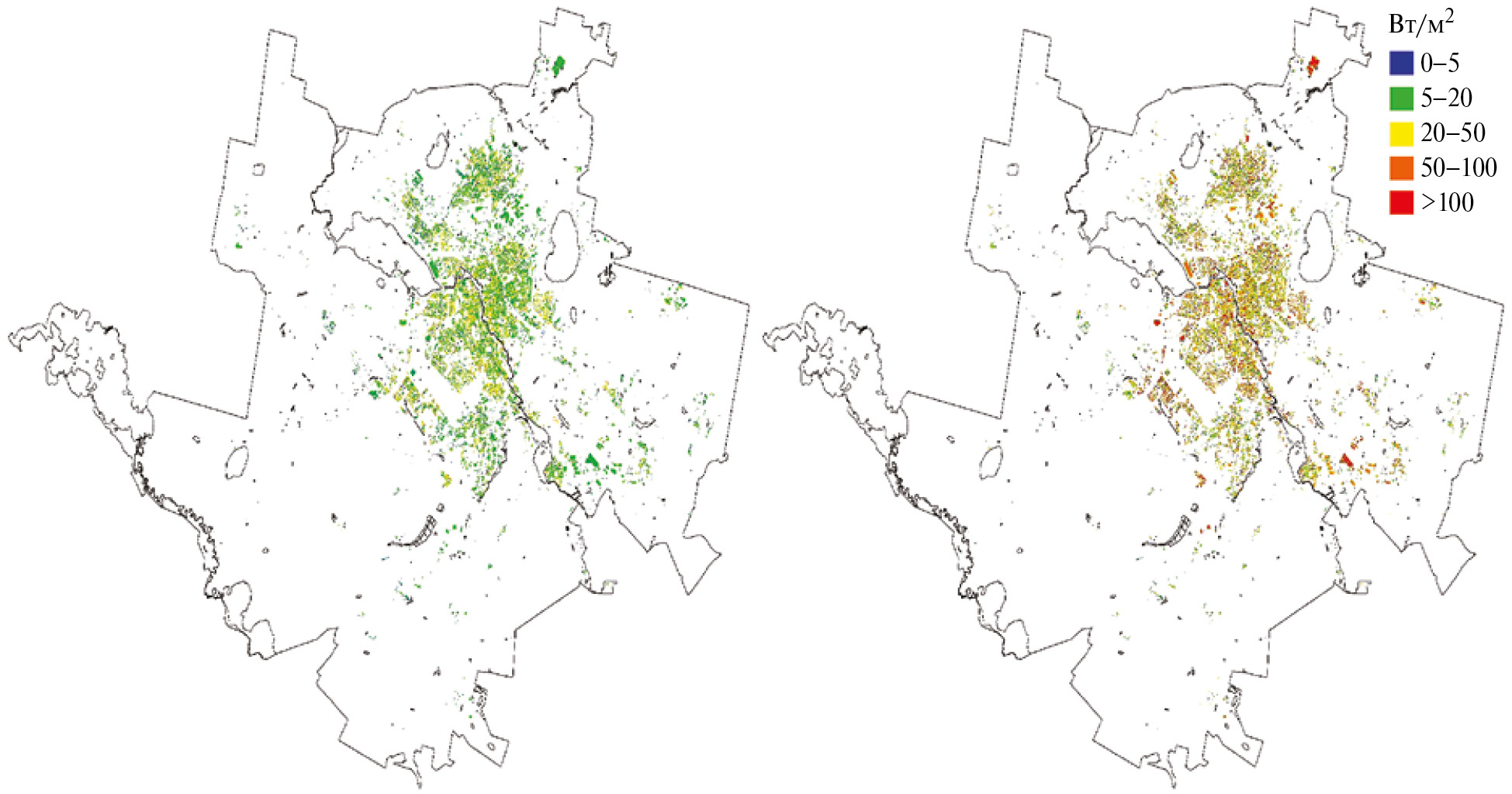 Рис. 3. Карты распределения плотности АПТ (Вт/м²) с урбанизированных территорий Москвы при наружной температуре воздуха tнар, равной средней температуре отопительного периода tот, по алгоритму 1 (слева) и алгоритму 2 (справа).