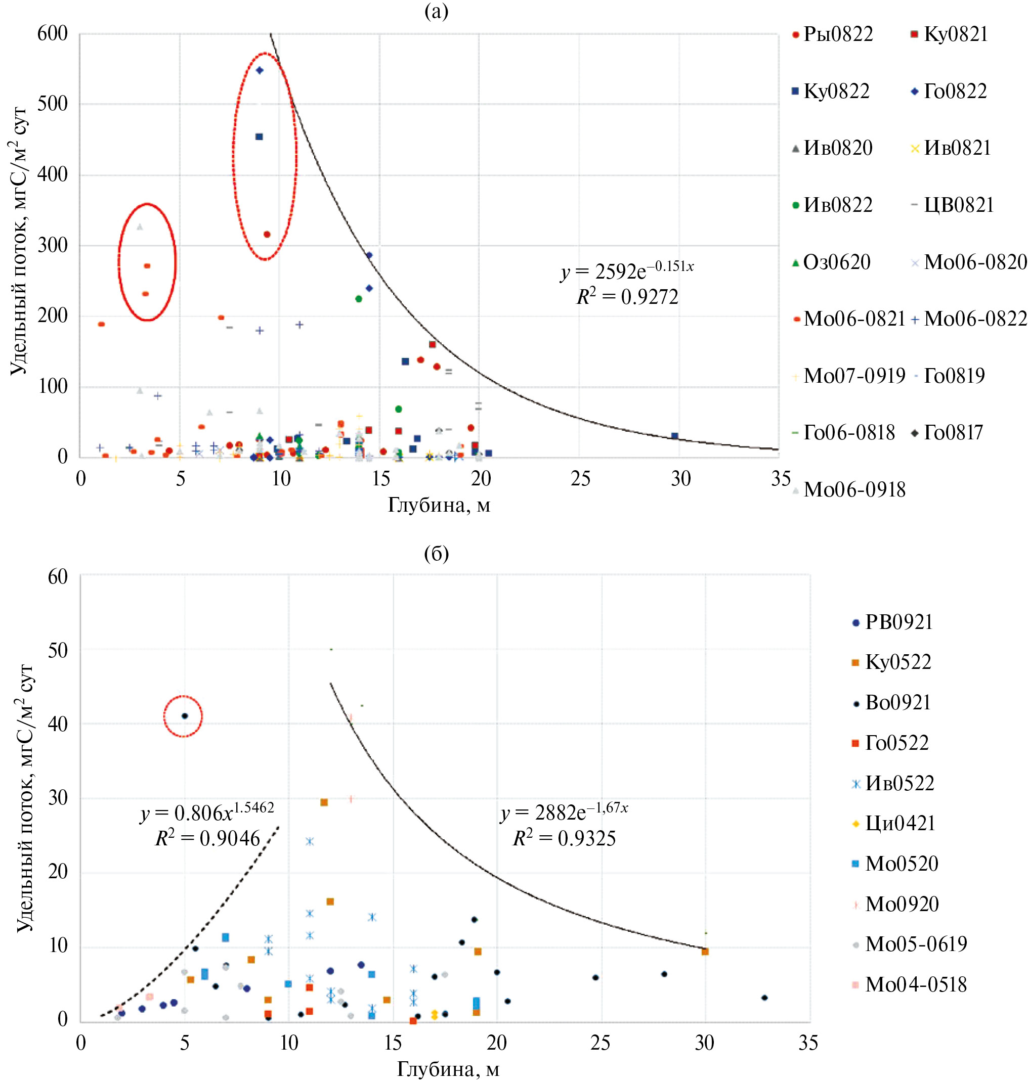 Рис. 3. Зависимость удельного потока метана с районов мелководных водохранилищ разной глубины: (а) – в период стратификации, (б) – при отсутствии стратификации.