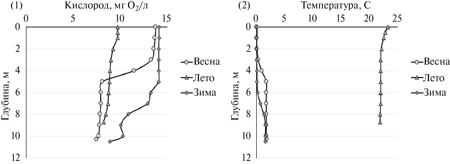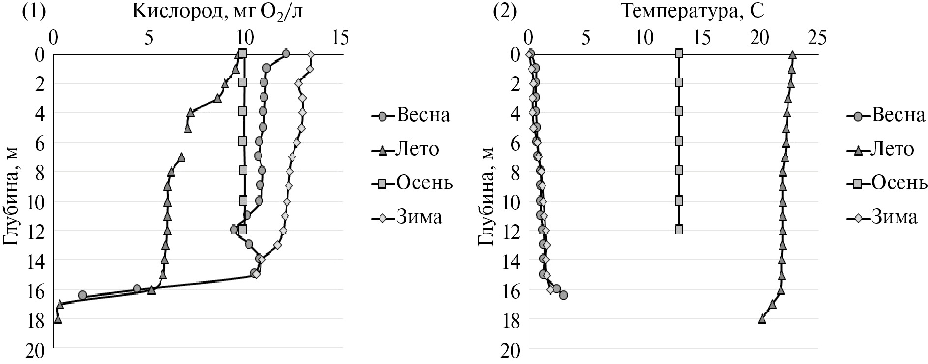 В зимний и весенний период содержание кислорода на станции составляет 70–90%-нас. по всей толще воды, что связано как с поздними сроками замерзания водохранилища, так и с наличием сбросов через гидротехнические сооружения и слабым потреблением кислорода гидробионтами. При этом, перед вскрытием содержание кислорода уменьшается на 10% относительно зимы. У дна (17–15м) фиксируется дефицит кислорода – 10–30%-нас. (1–2 мгO₂/л), что может приводить к увеличению потока метана из донных отложений. В летний период концентрации кислорода уменьшаются и уменьшается растворимость из-за возрастания температуры. На станции формируется прямая температурная стратификация, слой температурного скачка размыт и находится на глубине 3–8 м. Здесь же происходит уменьшение концентрации кислорода с 97 до 70%-нас. В придонных слоях фиксируется аноксия из-за отсутствия перемешивания и интенсивного разложения органического вещества. При этом, на поверхности концентрации кислорода достигают 110%-нас. (10 мгO₂/л) из-за развития фитопланктона. Во время осеннего перемешивания при зондировании концентрация кислорода составляет 93%-нас. (9,8 мгO₂/л) во всех горизонтах.