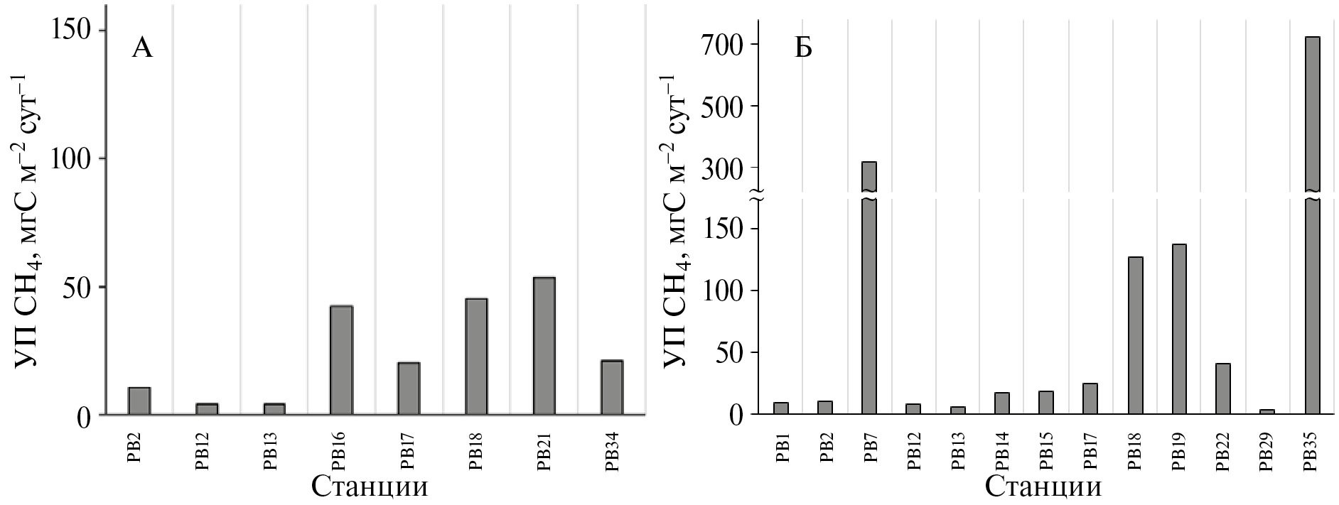 Рис. 9. Содержание метана на станциях измерений в поверхностном и придонном горизонтах в осенний (А) и летний (Б) сезоны.