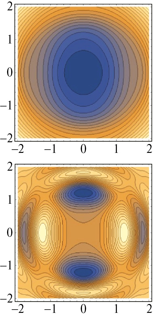 Изолинии бароклинного компонента полной функции тока (среднее течение плюс возмущение) на верхнем уровне для двух моментов времени t = 2 (верх) и t = 3 (низ) представлены на рис. 1. Этот компонент определяется выражением , , где ε – амплитудный параметр. Приняты значения S = 2, n = 2, μ = 2, ε = 0.001. Как видно, при потере устойчивости осесимметричного течения формируется система замкнутых вихревых ячеек.