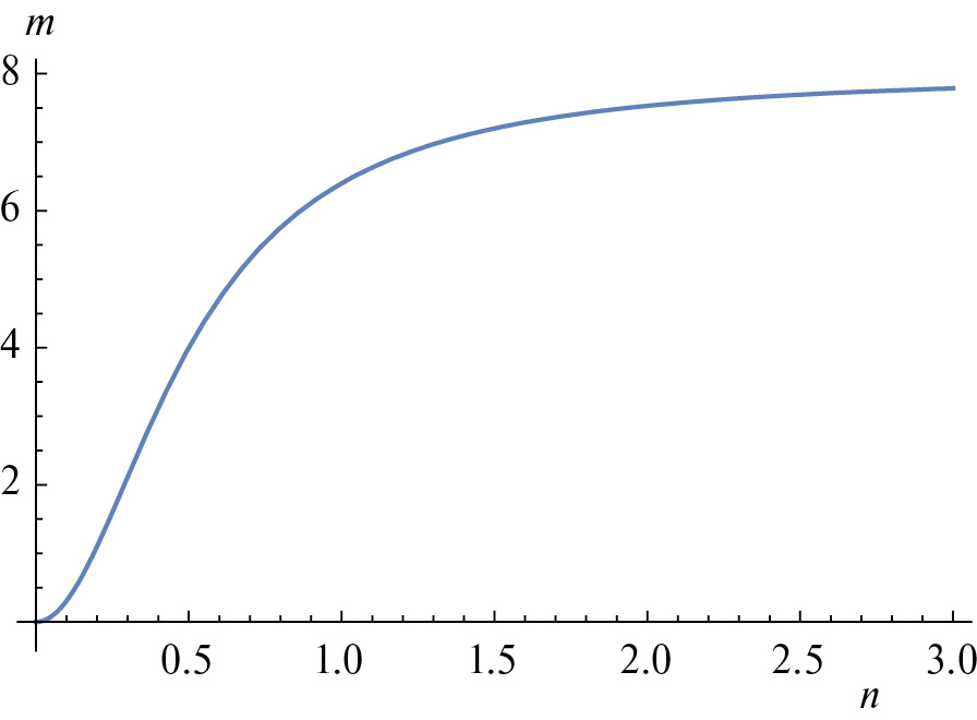 Рис. 2. Кривая нейтральной устойчивости на плоскости волновых чисел m = μ и n для значений параметров λ2 = 1/2h2 = 8, S = 2, R = 1