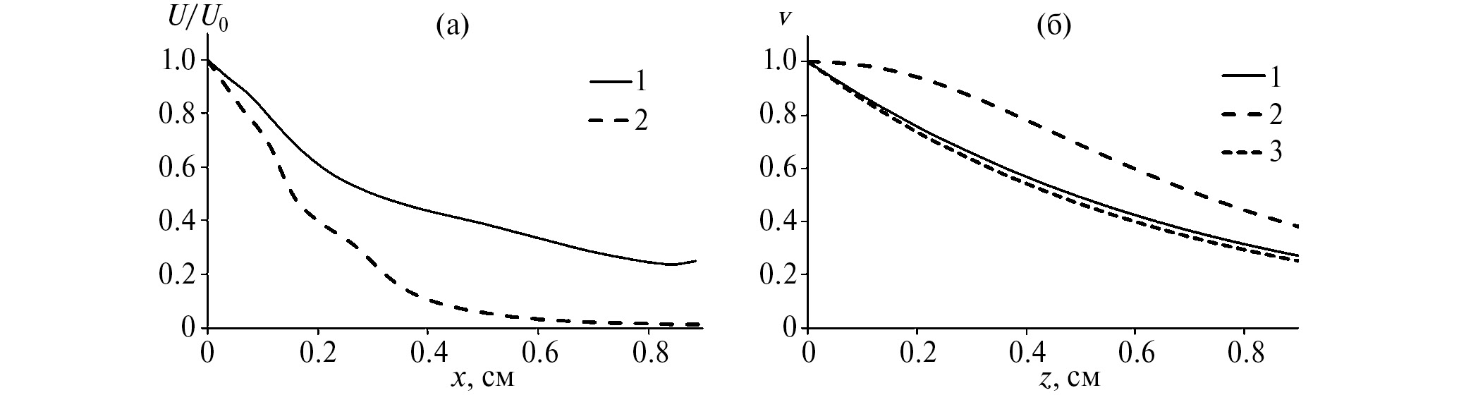 Рис. 4. а – нормированные на скорость дрейфа поверхности вертикальные профили горизонтальной скорости на расстоянии x = 40 см (точка 2 на рис. 1), полученные из PIV-измерений для 1 – воды, 2 – воды с SDS; б – зависимость возмущения скорости для k = 1.52 см-1 от глубины для 1 – воды, 2 – воды с SDS, 3 – “классического“ расчета (по формуле (9))