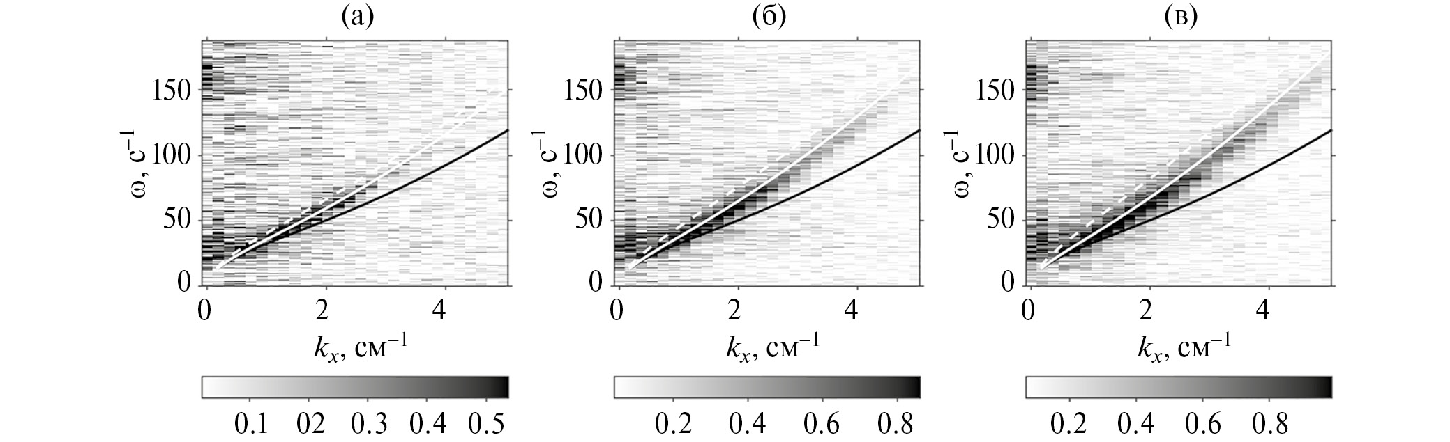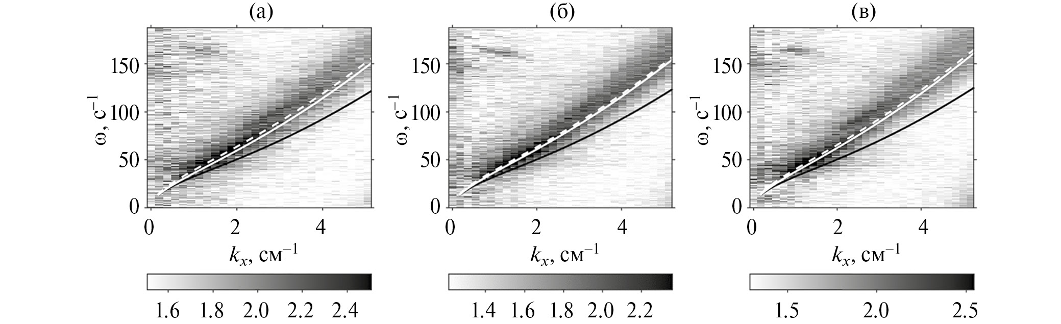 Рис. 6. Дисперсионные кривые для воды с добавлением SDS на расстоянии 40 см от начала канала: а – vair = 1.34 м/с, U0 = 8.06 см/с; б – vair = 2.08 м/с, U0 = 12.8 см/с; в – vair = 3.12 м/с, U0 = 19.3 см/с. Черная кривая – расчет по формуле (10), пунктирная – расчет по формуле (11), светлая кривая – расчет с учетом профиля скорости. Цветовые шкалы показывают десятичные логарифмы амплитуды спектральной плотности