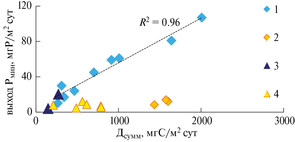 Совместный анализ интенсивности суммарной деструкции в ДО (Дсумм = Даэр + Данаэр + выход СН4), выхода Р и численности роющего зообентоса на станциях Иваньковского водохранилища (рис. 6), показал, что при численности бентоса менее 1300 экз/м2 даже при высокой интенсивности деструкции ОВ в ДО, выход Рмин в аэробных условиях не превышал 14 мг/м2 × сут. При высокой (более 1300 экз/м2 × сут) численности роющего бентоса увеличение деструкции ОВ в илах сопровождается ростом потока Рмин из ДО. Это связано с роющей деятельностью бентоса, способствующей, в том числе, выносу поровых вод донных отложений к границе раздела “вода–ДО”. Привлечение ранее полученных на Можайском водохранилище данных не противоречит полученным связям.