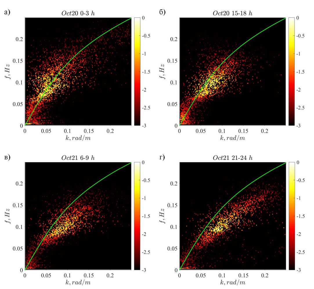 Пространственно-временные спектры волн, построенные по скорректированным данным, приведены на рис. 9 для четырех 3-часовых интервалов в первые двое суток измерений. Распределение спектральной энергии особенно хорошо соответствует теоретической дисперсионной зависимости в первые сутки (рис. 9а,б). В конце вторых суток наблюдается существенно отклонение от теоретического распределения, которое не удается заметно уменьшить при использовании другого выбора смещения отсчета времени для датчика B. Возможно, некоторую роль в отклонении данных от теоретической кривой для дисперсионного соотношения сыграли и течения, которые не измерялись независимо.