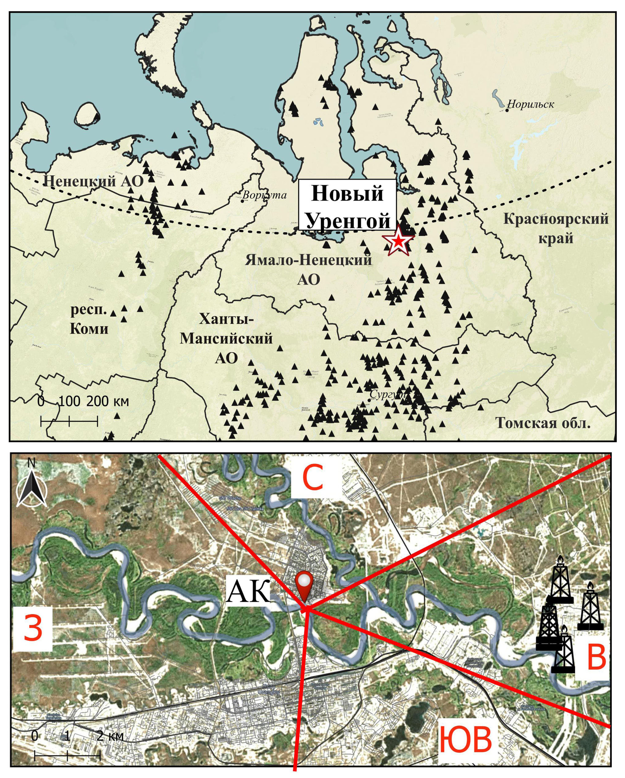 Рис. 1. Слева: город Новый Уренгой на карте Западной Сибири, указаны расположения газовых факелов нефтяных и газоконденсатных месторождений. Внизу: расположение Аэрозольного комплекса МГУ (АК) и объектов УНГКМ в Новый Уренгой. Секторы пространственного распределения источников черного углерода указаны линиями и названиями.