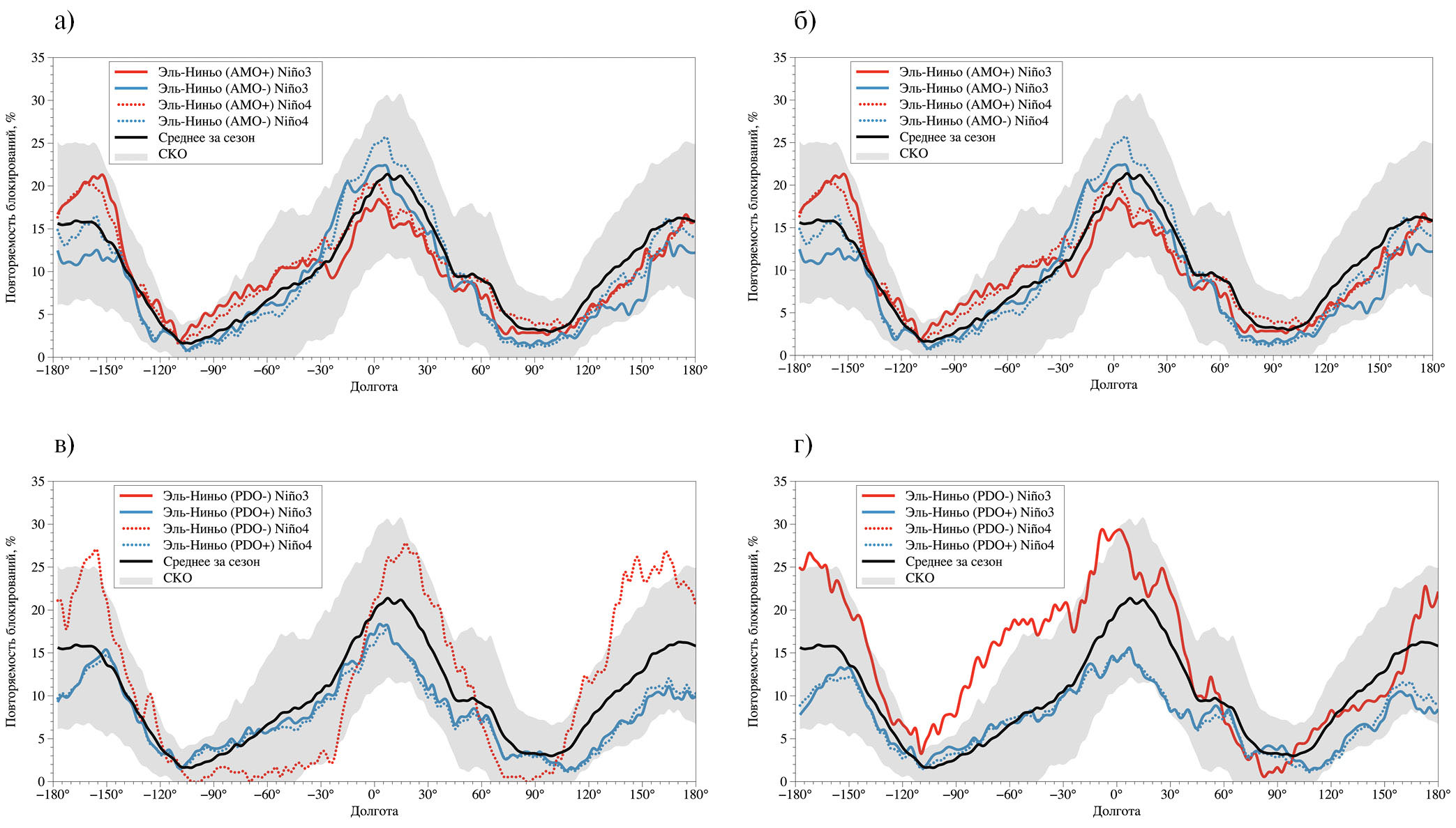 Рис. 3. Повторяемость зимних атмосферных блокирований в средних широтах Северного полушария в фазе Эль-Ниньо с использованием индексов Nino3 и Nino4, при разных фазах АМО (а, б) и PDO (в, г) в вариантах I (а, в) и II (б, г) на фоне средних значений (с заштрихованным диапазоном СКО) для всего периода 1979–2018 гг.
