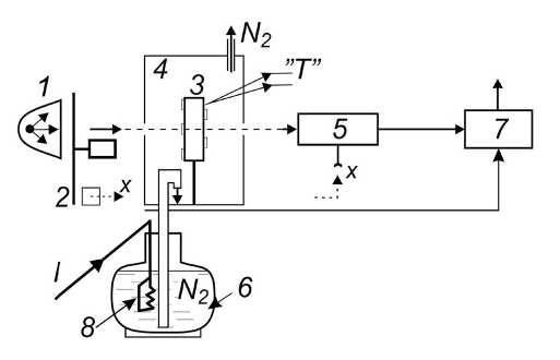 Излучение в видимом диапазоне от галогеновой лампы создавали источником (1) см. рис. 1. Пучок излучения модулировали диском с прорезями (2). Излучение проходило через пластинку из льда (3), на которую конденсируются пары воды, и поступало на фотодиод, усилитель и синхронный детектор (5). Образец находится в камере (4), охлаждаемой парами азота. Холодные пары азота поступают из сосуда Дьюара (6), их подача регулируется током (I) резистора испарителя (8). Температура поверхности пластины измеряется термопарой «T». Точность измерений температуры ~1°C. Информация поступает в систему ее сбора. Измерения были выполнены в лаборатории при температуре 20°C и относительной влажности воздуха 15…20 %. Установка выдерживалась в данных условиях в течение нескольких дней.