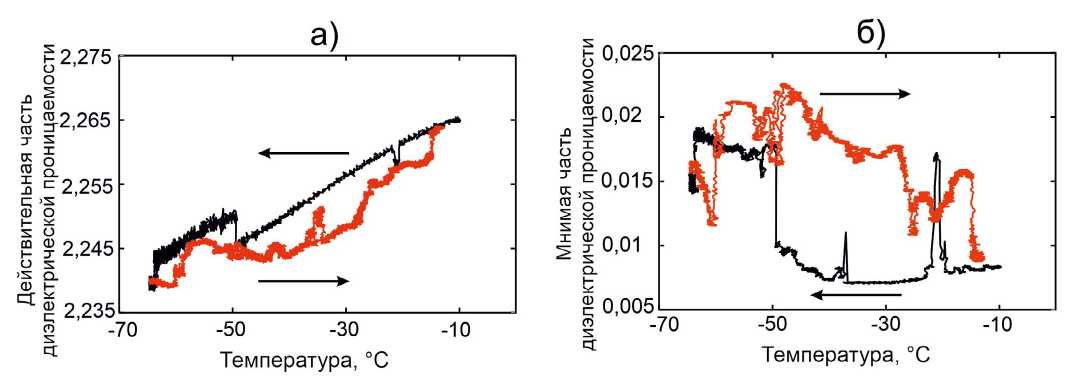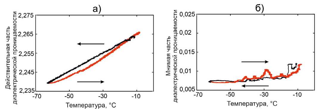 Рис. 4. Зависимости ε׳ (а) и ε״ (б) материала града от температуры при ее циклическом изменении. Измерение после 18 ч хранения града в холодильнике. Стрелки показывают направление изменения температуры.