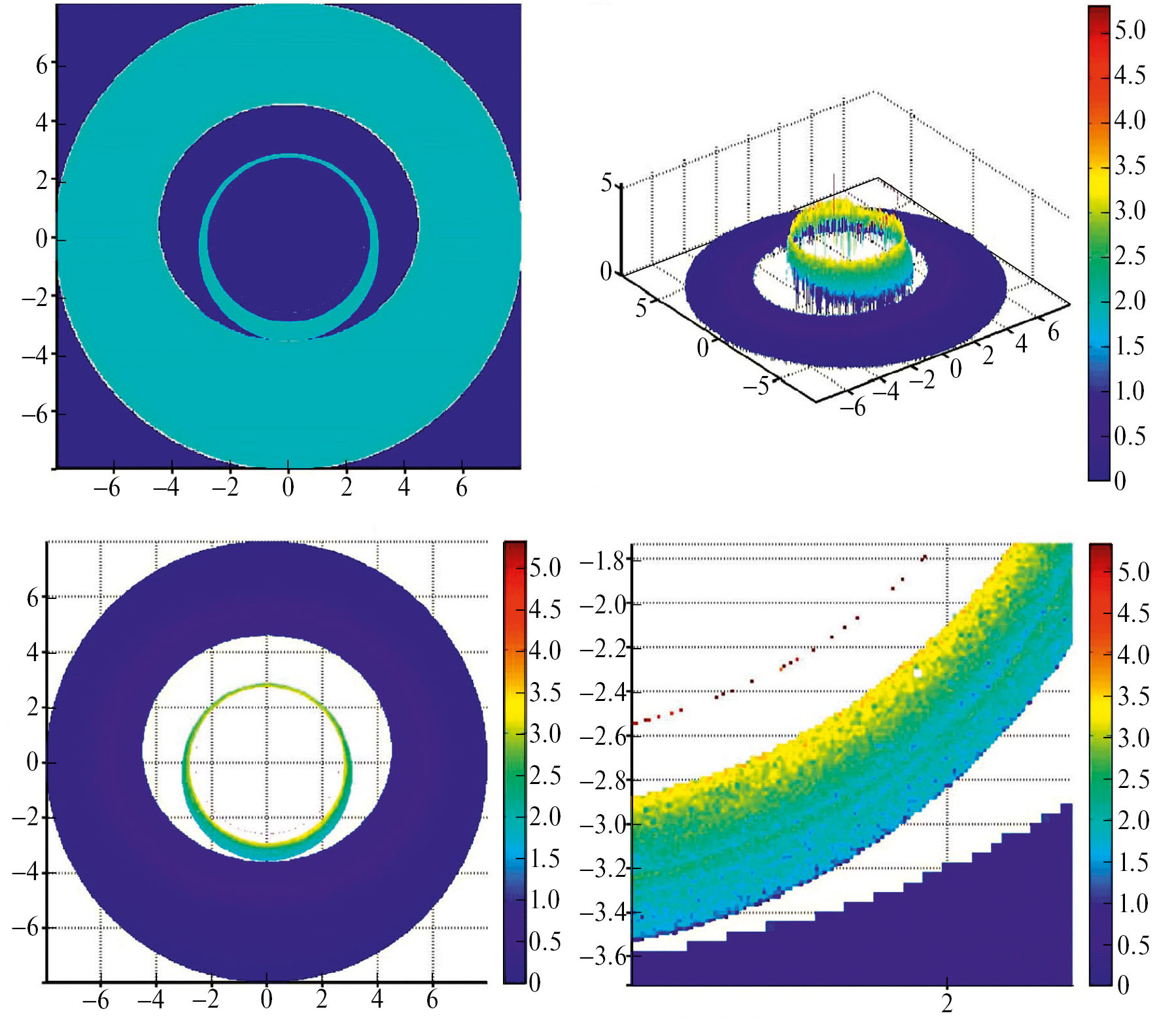 Для того чтобы сделать изображение тени ЧД более приближенным к реальной картине, было учтено, что каждый пиксель изображения содержит разное количество фотонов. Левая нижняя панель рис. 2–5 отображает относительную интенсивность излучения. Видно, что для гало она медленно спадает по мере увеличения радиуса, что соответствует падению температуры для релятивистского диска. Правая верхняя панель позволяет проиллюстрировать различие интенсивностей фотонного кольца и гало, видно, что их отношение составляет примерно три порядка. Нижняя правая панель позволяет рассмотреть фотонное кольцо более подробно и увидеть, что его внешний (более близкий к гало край) имеет гораздо большую интенсивность, чем внутренний.